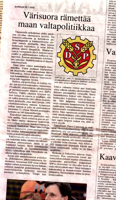 27. tammikuuta 2000/26 Tällä viikolla: Värisuorat SDP ja Keskisuomalainen Oy. Uusia tappajan ystäviä. "Sippulanniemen golf-kaava hyväksyttiin mutinoin Jyväskylässä". |