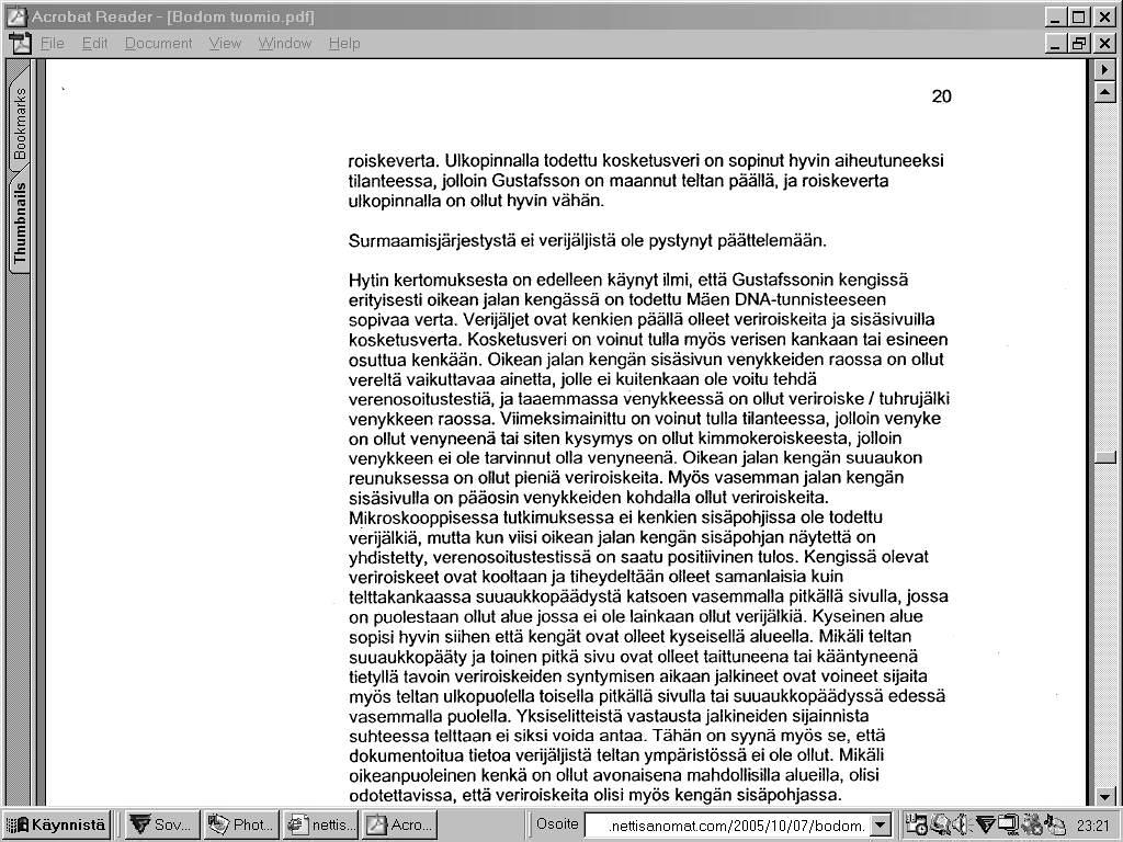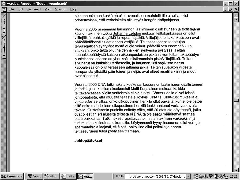 nettisanomat - 2005/10/07 - Kuva: Ruhjotut kasvot. - Bodom - oikeudenkäynti - tuomio kokonaisuudessaan - Espoon käräjäoikeus - Laamanni Heikki Mikkola, puheenjohtaja - Käräjätuomari Juha Lehto - Lautamiehet Agneta Brenner, Marja Rahkonen, Vilho Juutinen ja Peter Wellmann - Johtava kihlajunnansyyttäjä Tom Ifström, kihlakunnansyyttäjä Heli Haapalehto - vastaajana Nils Wihelm Gustafsson - Asia: kolme murhaa - MTV3:n seitsemän uutiset - Nils Gustafsson - vapauttava tuomio - Kuvat Pertti Manninen - perjantaina 07.10.2005 - kuva - kuvat - pertti manninen - nettisanomat |