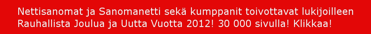 Nettisanomat 2011 - Joulukuu - Nettisanomat ja Sanomanetti dekä kumppanit toivottavat lukijoilleen Rauhallisya Joulua ja Üutta Vuotta 2012! 30 000 sivulla! Nettisanomat - Sanomanetti - Blogi: Viikkosanomat.fi - Kuvasanomat - Sanomatori - Viikkosanomat - Härkää sarvista - |