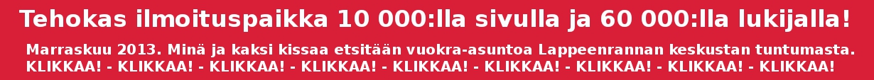 Nettisanomat 2013 - Minä ja kaksi kissaa etsitään vuokra-asuntoa Lappeenrannan keskustan tuntumasta. - Nettisanomat - Sanomanetti - 12.fi - marraskuu 2013 - Nettisanomat - Sanomanetti - Blogi: Viikkosanomat.fi - Kuvasanomat - Sanomatori - Viikkosanomat - Härkää sarvista - |
