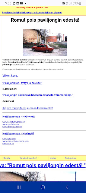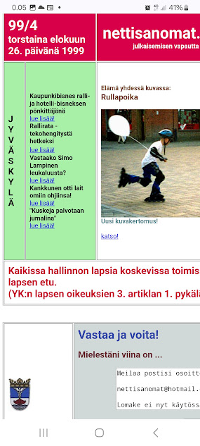 Nettisanomat.com - nro 3091 - Lauantai 31.5.2025. - SIVU4 - Kuvalinkit etusivuille: Maaliskuussa 2025. 1.3. 2.3. 3.3. 6.3. 8.3. 12.3. 13.3. 14.3. 19.3. 23.3. 24.3. 25.3. 27.3. 29.3. 31.3. Maaliskuussa 2025. . . -------- JJKaraoke Tmi Jari Jääskeläinen 03600 Karkkila, Uusimaa 050 40 10 130 jaske [ ät ] jjkaraoke.fi Palveluehdot JJ Karaoke ei vastaa karaoken aiheuttamasta lauluriippuvuudesta eikä äkillisestä mielialan kohoamisesta. jjkaraoke.fi - Arkisto. 20 vuotta sitten. "Ensimmäinen hellepäivä." 26.05.2005. Katso! ------ - - - - --- ---- SMILE from MODERN TIMES - ---SIVU4 - Lauamtai 31.5.2025. - Kuvasanomat - Sanomatori - Viikkosanomat - Härkää sarvista - 12.fi - N:o 3091 - 2025-06-01 , nettiin 2025-06-01 21:09, linkkejä 2025-06-01. "Haukkaavan logon" teki Jaikon kurssilla 1999 Mika. Ensimmäisen kerran logo oli lehdessä tortaina 30.9.1999. Pari vuoden jälkeen se korvautui steriilillä kirjainlogolla. Nyt se on taas mukana!