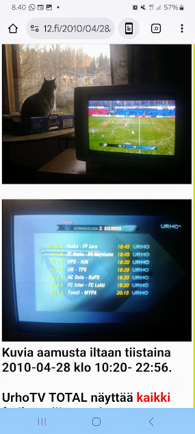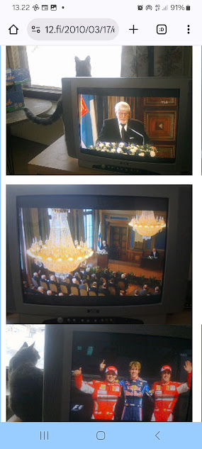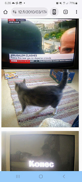 17.3.2010. Kuvia sarjasta. Perjantai-illasta tiistai-aamuun. Lauantai 2010-03-13 klo 11:29 TV1 lähettää suoraa kuvaa Säätytalolta Helsingistä. jossa pidetään parhaillaan Talvisodan päättymisen 70-vuotispäivänä juhlatilaisuutta. Puhujana näyttää olevan Ohto Mannisen näköinen mies, toivottavasti näkökuva on oikea. Lauantai 2010-03-13 klo 14:07 MTV3 Maxilta tulee suoraa F1-aika-ajoista. Nopeimmat ovat Vettel, Alonso ja Massa. Red Bull ja Ferrarit. Rasmus-kissan mielenkiinto on kohdistunut lumisessa maisemassa piipahtaviin lintuihin. Kuvat Pertti Manninen. ![]() Sarja. Perjantai-illasta tiistai-aamuun. Kuvia. Tiistai 2010-03-15 klo 10:06. BBC World LIVE Jerusalem 10:06 Local JERUSALEM CLASHES Police fire teargas to disperse crowds. Tiistai 2010-03-15 klo 10:07. Rasmus-kissa. Tiistai 2010-03-15 klo 10:28 SUB Junior. Konec. Loppu. Isommassa kuvassa on peilikuvakin aistittavissa. Kuvat Pertti Manninen. ![]() Kuvia sarjasta. Perjantai-illasta tiistai-aamuun. |