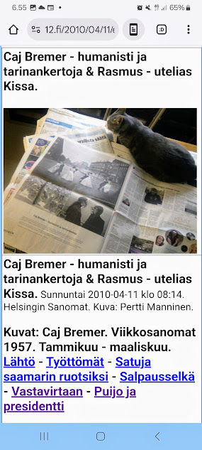 11.4.2010. Caj Bremer - humanisti ja tarinankertoja & Rasmus - utelias Kissa. Sunnuntai 2010-04-11 klo 08:14. Helsingin Sanomat. Kuva: Pertti Manninen. ![]() ![]() https://www.nettisanomat.com/2010/04/11/etusivu.htm |