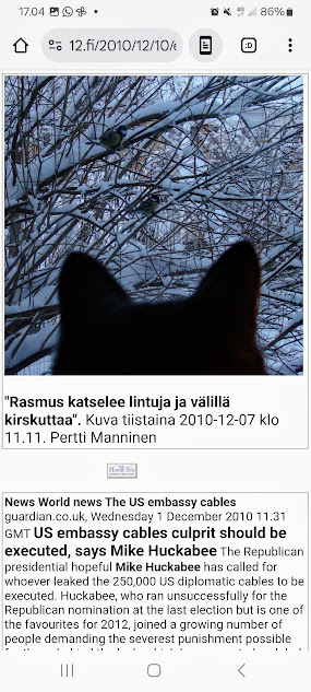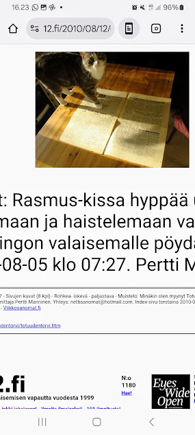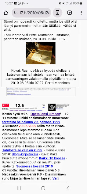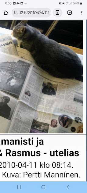 Nettisanomat.com - N:o 3098 - Tiistai 24.6.2025. Arkisto. Rasmuksen matkassa 17 vuotta. Kiitos. Lue! - 20.10.2008 - täällä - 17.3.2010. - 11.4.2010. . 27.4.2010. - 28.4.2010. . 12.8.2010. - 15.10.2010. . 10.12.2010. - 8.2.2011. . 14.8.2011. - 7.10.2011. - 12.10.2011. - 17.10.2011. - 20.10.2011 - 24.10.2011. - 2012 - Tulossa! - Kuva. Emo ja vasa. Metsäkauris ja parikuukautinen vasansa metsän siimeksessä. Uusimaa. Kirkkonummi. Björkdal. Tiistai 24.6.2025 07:12. Kuva Pertti Manninen. - 24.6. Johannes, Juhani, Jussi, Jani, Janne, Juha, Juhana, Juho, Jukka. - Ian, Jack, Jan, Janne, Jean, Jens, Johan, Johannes, John, Johnny, Jon. ----- Nettisanomat.com - N:o 3097 - Lauantai 21.6.2025. Juhannuspäivä. Suomen lipun päivä. - . Lauantai 21.6.2025. Juhannuspäivä. Suomen lipun päivä. - Ahti, Ahto. - Kuva. Lippu liehuu. Uusimaa. Karkkila. Vuotinainen. Maanantai 26.5.2025. Kuva Pertti Manninen. ------- Nettisanomat.com - N:o 3096 - Perjantai 20.6.2025. Juhannusaatto - Into. - Maailman pakolaispäivä. - Arkistokuva. - Kivisaaren juhannuskokko "65 vuotta sitten". Kivisaari. Helsinki. Vuonna 1960 (n.). Ullakolta löytyneestä paperikuvasta lauantaina 2008-06-21. Sinistys ja kontrasti perjantaina 2011-06-24. Pertti Manninen. - Arkisto. Ilta-Sanomat sunnuntai 26.02.2017. Tutkijalta kova vertaus: Presidentti Niinistö ja Teuvo Hakkarainen puhuvat pakolaisista samalla tyylillä. "Helsingin yliopiston tutkijatohtori Jouni Tilli vertaa tuoreessa kirjassaan Miten puhumme, kun puhumme politiikkaa? Tasavallan presidentti Sauli Niinistön (kok) ja kansanedustaja Teuvo Hakkaraisen retoriikkaa. Arkisto. Torstaina 2.3.2017. - Arkisto. Sauli Niinistö: "Jokainen, joka osaa sanoa sanan "asylum", turvapaikka pääsee sisään Eurooppaan ja Suomeen. Sana tuottaa subjektiivisen oikeuden ylittää raja." Nettisanomat perjantai 05.02.2016. KUVASARJA. ------ Nettisanomat.com - N:o 3095 - Keskiviikko 18.6.2025. - Arkisto. - etusivu 07.06.01. Kesän hyvä teko: Opeta lapsi uimaan! Uimakoulut kutsuvat! Sinnikäs yksityisopetuskin kannattaa! - Kuvat. - "erika, sorsien sukua." "uimassa." unelmoituja kuvia. pertti manninen hyttysessä viimeisenä kesänä 2000. anna-marin muistolle. kettu. - ------ Nettisanomat.com - N:o 3094 - Sunnuntai 15.6.2025. - Luonnonkukkien päivä. - Huhtikuussa. Kuuma päivä. Keskiviikko 2.4.2025. 10:55. Rasmus-kissa viihtyy aurinkoisessa häkissään. 11:12. Keltaiset puskevat ruskean läpi. Uusimaa. Kirkkonummi. Björkdal. Kuvat Pertti Manninen. 5 kuvaa. - Huhtikuussa. "Sielu lepää." Uusimaa. Kirkkonummi. Vesterkulla. Lauantai 19.4.2025 11:33. Pertti Manninen. ------- Nettisanomat.com - N:o 3093 - - - - - - -- - - - - ---- SMILE from MODERN TIMES - --- etusivu - Tiistai 24.6.2025. - Kuvasanomat - Sanomatori - Viikkosanomat - Härkää sarvista - 12.fi - N:o 3098 - 2025-06-24 ja 2025-06-25, nettiin 2025-06-25 15:59, linkkejä 2025-06-25. 2025-06-27 21:00. - Kuvien tekstit. "Haukkaavan logon" teki Jaikon kurssilla 1999 Mika. Ensimmäisen kerran logo oli lehdessä tortaina 30.9.1999. Pari vuoden jälkeen se korvautui steriilillä kirjainlogolla. Nyt se on taas mukana!