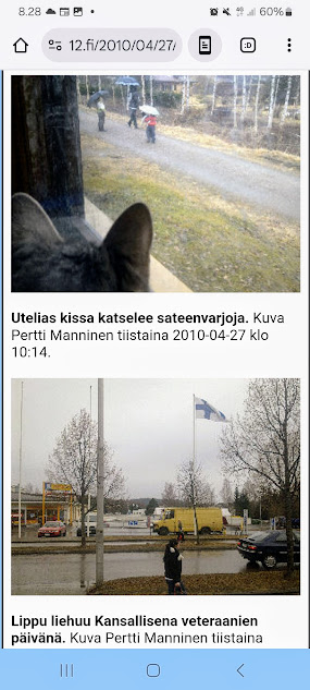 27.4.2010. Kuvasarjasta. Utelias kissa katselee sateenvarjoja. Tiistaina 2010-04-27 klo 10:14. Lippu liehuu Kansallisena veteraanien päivänä. tiistaina 2010-04-27 klo 10:15. Keski-Suomi. Jyväskylän seutu. Laukaa. Laukaantie. K-Market ja Alko Rosannen ikkunasta. Kuvat Pertti Manninen.
