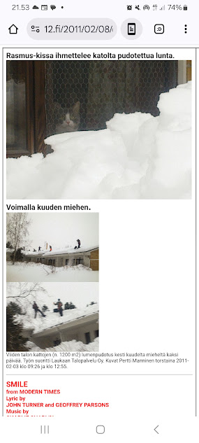8.2.2011. ![]() Rasmus-kissa ihmettelee katolta pudotettua lunta. Voimalla kuuden miehen. Viiden talon kattojen (n. 1200 m2) lumenpudotus kesti kuudelta mieheltä kaksi päivää. Työn suoritti Laukaan Talopalvelu Oy. Kuvat Pertti Manninen torstaina 2011-02-03 klo 09:26 ja klo 12:55. |
