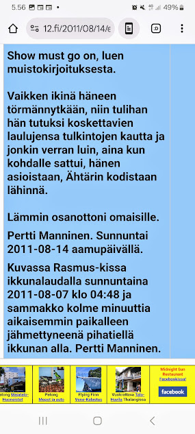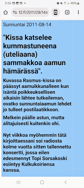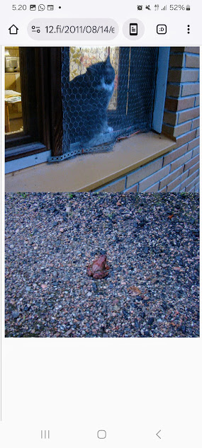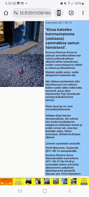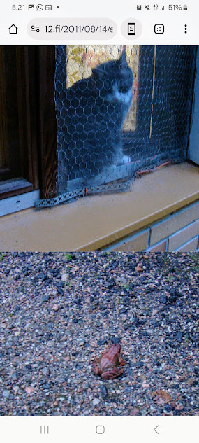 14.8.2011. ![]() Sunnuntai 2011-08-14 "Kissa katselee kummastuneena (uteliaana) sammakkoa aamun hämärässä". Kuvassa Rasmus-kissa on päässyt aamuikkunalleen kun isäntä poikkeuksellisen aikaisin lähtee tutkaileman, ovatko sunnuntaiaamun lehdet jo tulleet postilaatikkoon. Melkein päälle astun, mutta alitajuisesti kuitenkin ohi. Nyt viikkoa myöhemmin tätä kirjoittaessani soi radiosta kolme vuotta sitten tallennettu konsertti, jossa eilen edesmennyt Topi Sorsakoski esiintyy Kulkukoiriensa kanssa. Show must go on, luen muistokirjoituksesta. Vaikken ikinä häneen törmännytkään, niin tulihan hän tutuksi koskettavien laulujensa tulkintojen kautta ja jonkin verran luin, aina kun kohdalle sattui, hänen asioistaan, Ähtärin kodistaan lähinnä. Lämmin osanottoni omaisille. Pertti Manninen. Sunnuntai 2011-08-14 aamupäivällä. Kuvassa Rasmus-kissa ikkunalaudalla sunnuntaina 2011-08-07 klo 04:48 ja sammakko kolme minuuttia aikaisemmin paikalleen jähmettyneenä pihatiellä ikkunan alla. Pertti Manninen. |