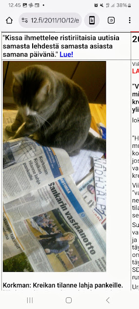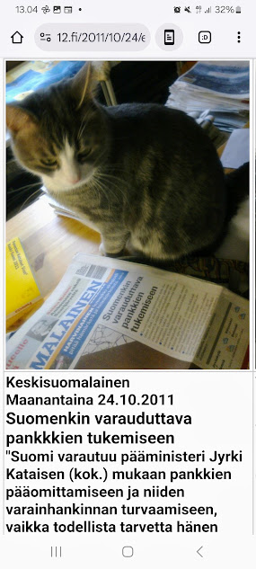 12.10.2011. "Kissa ihmettelee ristiriitaisia uutisia samasta lehdestä samasta asiasta samana päivänä." Sdp:n puoluevaltuusto Sankarin vastaanotto Puheenjohtaja Jutta Urpilainen sai kiitosta takausvastuiden hoitamisesta. " ... https://www.nettisanomat.com/2011/10/12/etusivu.htm
