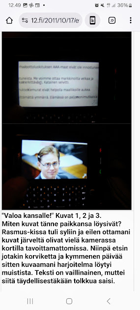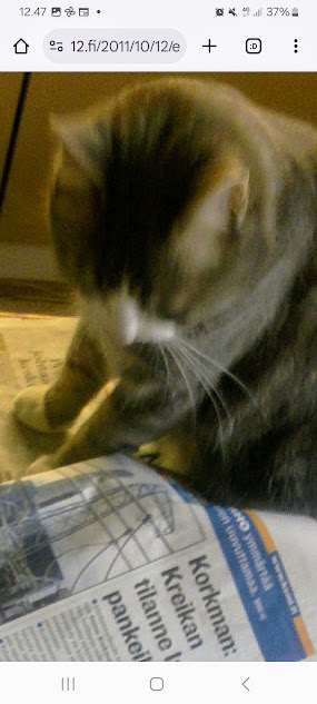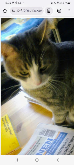 17.10.2011. ![]() "Valoa kansalle!" Kuvat 1, 2 ja 3. Miten kuvat tänne paikkansa löysivät? Rasmus-kissa tuli syliin ja eilen ottamani kuvat järveltä olivat vielä kamerassa kortilla tavoittamattomissa. Niinpä etsin jotakin korviketta ja kymmenen päivää sitten kuvaamani harjoitelma löytyi muistista. Teksti on vaillinainen, muttei siitä täydellisestäkään tolkkua saisi. ... |