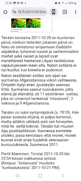 20.10.2011. Torstai 2011-10-20 klo 23:54 kissan nukkuessa sylissä. ![]() Tänään torstaina 2011-10-20 on kuoleman päivä, niinkuin tietenkin jokainen päivä on.