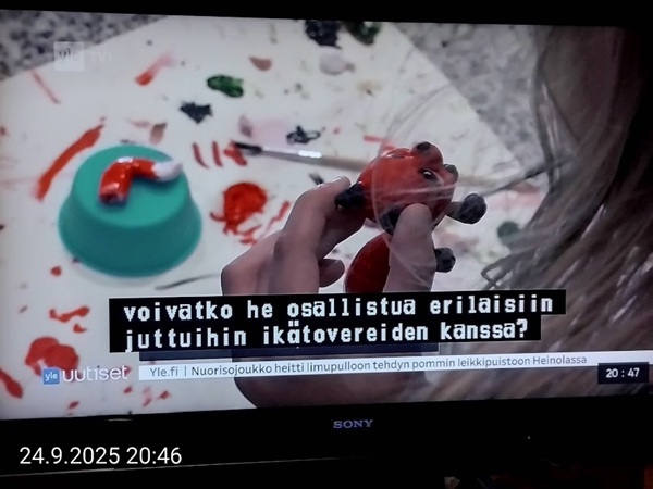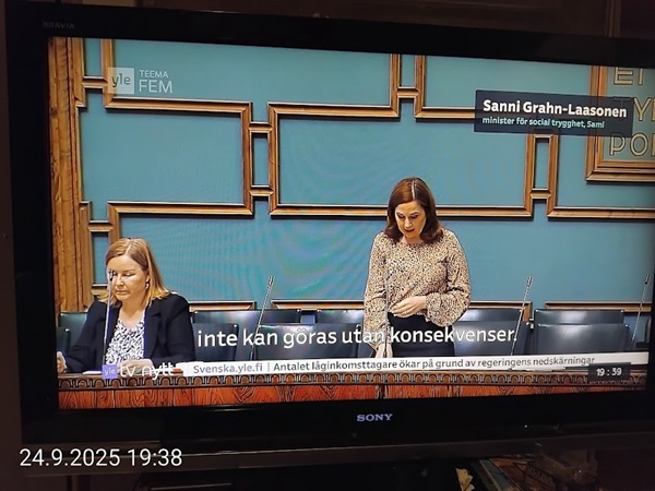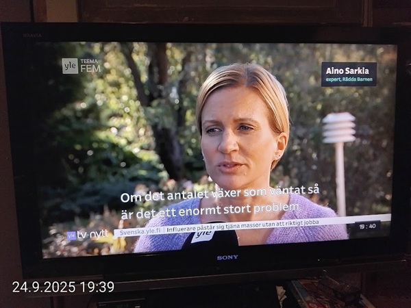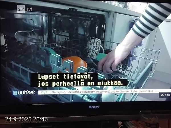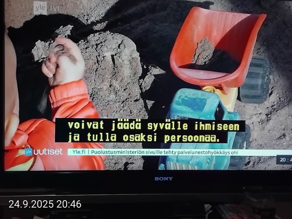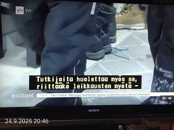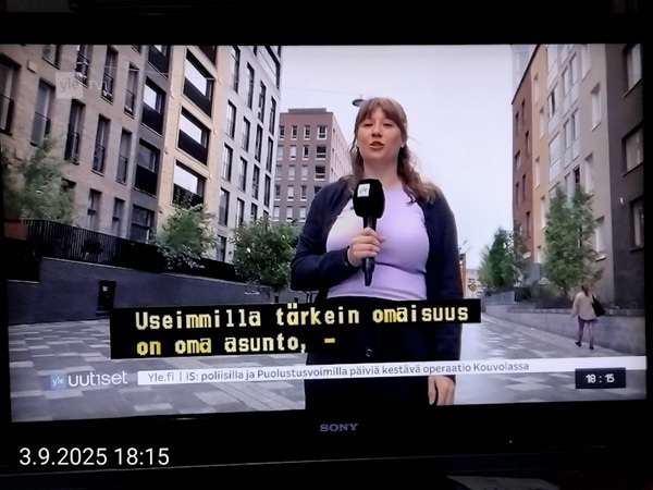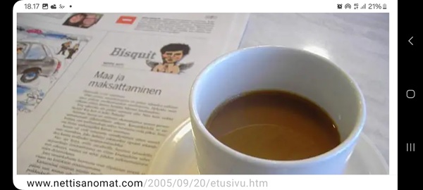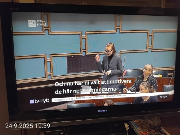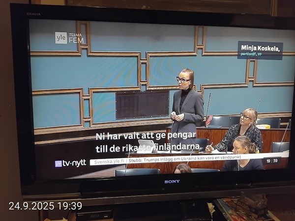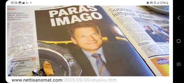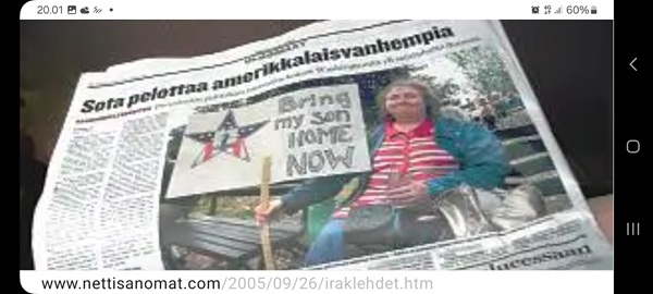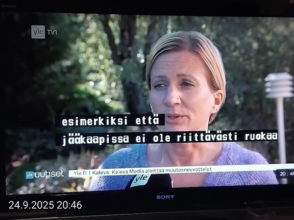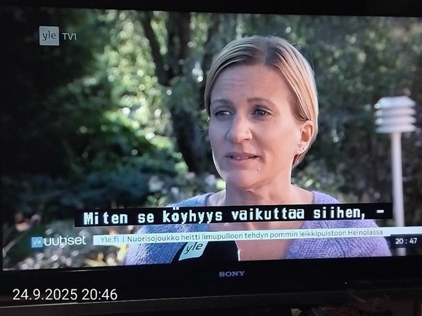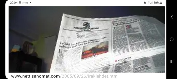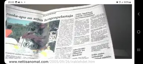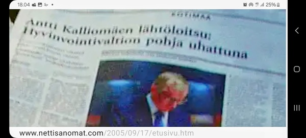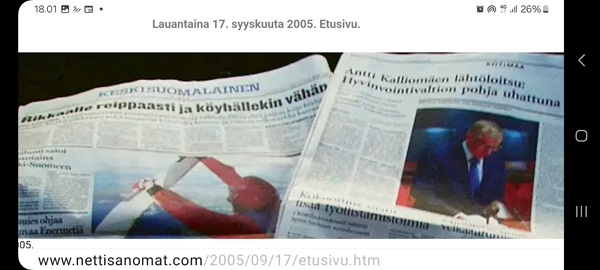 Nettisanomat.com - N:o 3163 - Maanantai 29.9.2025 - Etusivu - Lukijan kuva. "Perhonen molemmin puolin". Kuvat lähetti Erika N. lauantaina 27.9.2025 20:38 ja 20:42. - Onko ulkopuolella, hieno kuva. - Joo ulkopuolella, et tuo on mahapuoli. - Siitä vaan tunnistamaan! --- Arkisto 2005Arkisto 2005 - 20 vuotta sitten. Helsingin Sanomat perjantaina 23.09.2005. "Fortumin johdolla päällekkäiset palkkiot". Pääkirjoitus Nettisanomat keskiviikkona 28. syyskuuta 2005. Ajankohta, Fortum, Helsingin Sanomat, ministerit, optiot, psykopaatit, varallisuusveron poisto ja virkamiehet. Aakkosjärjestyksessä toisiinsa kietoutuvaa moskaa. Lue! --- - Arkisto 2005 - Kuvat - 20 vuotta sitten 28.9.2005- 29.9.2005. 28.09.2005 keskiviikkona klo 16:11. Kuva. "Naakat pelmahtavat lentoon matoapajiltaan eilen kynnetyltä pellolta rapsahduksen kuultuaan." Pertti Manninen. Sarjasta Lintuja.Tulossa! 28.09.2005 keskiviikkona klo 16:11. Kuva. "Varikset ja naakat matoapajillaan eilen kynnetyllä pellolla." Pertti Manninen. Sarjasta Lintuja. 28.09.2005 keskiviikkona klo 16:38. Kuva. "Liehuvatukkainen mopotyttö pysähtyy risteyksessä ja jatkaa sitten reippaasti matkaansa". Laukaa. Pertti Manninen. Sarjasta koululaisia. Tulossa! 28.09.2005 keskiviikkona klo 16:38. Kuva. "Pysähdyttyään risteyksessä liehuvatukkainen mopotyttö jatkaa reippaasti matkaansa". Laukaa. Kuva ja tuuli Pertti Manninen. Sarjasta koululaisia. Tulossa! 20 vuotta sitten. Helsingin Sanomat perjantaina 23.09.2005. "Fortumin johdolla päällekkäiset palkkiot". Pääkirjoitus Nettisanomat keskiviikkona 28. syyskuuta 2005. Ajankohta, Fortum, Helsingin Sanomat, ministerit, optiot, psykopaatit, varallisuusveron poisto ja virkamiehet. Aakkosjärjestyksessä toisiinsa kietoutuvaa moskaa. Lue! Les Enfants TERRIBLES ---------- Nettisanomat.com - N:o 3162 - Perjantai 27.9.2025 - Etusivu - Kuvat - Ylen uutiset-uutisissa köyhyydestä keskiviikkona 24.9.2025. ...voivat jäädä syvälle ihmiseen ja tulla osaksi persoonaa. Yle.fi Puolustusministeriön sivuille tehty palveluksenestohyökkäys ohi. Tutkijoita huolettaa myös se, riittäkö leikkausten myötä - vähävaraisilla perheillä rahaa hyvään ravintoon ja kunnon vaatteisiin. Lapset tietävät, jos perheellä on niukkaa. esimerkiksi että jääkaapissa ei ole riittävästi ruokaa. Voi olla hyvinvoinnin kokemuksissa puutteita. Erityisen merkityksellinen lapsilla on sosiaaliset suhteet. Miten se köyhyys vaikuttaa siihen, voivatko he osallistua erilaisiin juttuihin ikätovereiden kanssa? Yle.fi Nuorisojoukko heitti limupullooon tehdyn pommin leikkipuistoon Heinolassa. THL:n mukaan psykiatrian sairaalapaikkoja on liian vähän, Jyväskylässä on jouduttu turvautumaan hätäratkaisuihin. Ylen uutiset-uutisissa köyhyydestä keskiviikkona 24.9.2025. Katso myös! Ylen tv nytt-uutisissa köyhyydestä keskiviikkona 24.9.2025 täällä. Mukana ministeri Sanni Grahn-Laasonen, puheenjohtaja Minja Koskela sekä asiantuntija Aino Sarkia Pelastakaa Lapset ry:stä, joka on myös tässä yläkuvissa. Kuvat. "Kaikki mikä hetkeen tarttui". Pertti Manninen. - Arkisto 2005 -- - 20 vuotta sitten 25.9.2005- 27.9.2005. 25.09.2005 sunnuntaina klo 12:56. Kuva. "Musta lintu lähellä". Siinä ne lentelivät ees taas kiitävällä vauhdilla välillä sekunniksi pariksi oksalle poiketen. Tähtäys ja kuva, välillä myöhässä ja kerran pari ajoissa! Sarjasta Lintuja. Pertti Manninen. 25.09.2005 sunnuntaina klo 12:57. Kuva. "Musta lintu oksalla". Sarjasta Lintuja. Pertti Manninen. 26.09.2005 maanantaina klo 15:50. Kuva. "Ruska loistaa kaikissa väreissä." Laukaa. Pääkirjaston istutuksia. Pertti Manninen. Sarjasta Ruska. Tulossa! 26.09.2005 maanantaina klo 15:16. Kuva. "YIT - yksin itse taivallan." Uudisrakennuksen työmaaparakkien ohikulkijat ajatuksissaan. Laukaa. Pertti Manninen . Sarjasta ihmisiä askareissaan. Tulossa! 27.09.2005 tiistaina klo 12:32. Kuva. "Ruska ruskistaa nuoret koivut." Fasaanien ja muiden lintujen turvapaikka väistyy pikkuhiljaa rakentajien tullessa, onneksi kuitenkin talvea vasten. Poikaset ovat jo isoja. Laukaa. Pertti Manninen. Sarjasta Ruska. Tulossa. 27.09.2005 tiistaina klo 20:06. Kuva. "Köyhyys ja ankeus, onneksi ilma on kuitenkin tänään harvinaisen lämmin". Köyhä ihminen kaivelee kaupan roskalaatikkoa etsien jotakin suuhun pantavaa. Kuvan toinen nimi: "Roskisdyykkari". Pertti Manninen. Sarjasta köyhiä ihmisiä. Tulossa! "Bring my son HOME NOW" "Sota pelottaa amerikkalaisvanhempia. Rauhanmielenosoitus: Presidentin politiikan vastustus kokosi Washingtoniin yli satatuhatta ihmistä." Otsikko. "Ann Bean kertoo valvovansa joka yö odottaessaan uutisia kolmatta kertaa Irakissa palvelevasta pojastaan Aronista. - Odotus on kauheata, haluan hänet takaisin kotiin, Bean rukoilee." Kuvateksti. Keskisuomalainen maanantaina 26.09.2005. Mika Horelli. (8 palstaa ylhäällä). Tulossa! Lue! "Irakin sodan vastustajat osoittivat mieltään. Lontoo. Lontoon keskustaan kooontui lauantaina useita tuhansia mielenosoittajia, jotka vaativat sotatoimien lopettamista Irakissa ja brittijoukkojen nopeaa kotiuttamista. Myös Roomassa, Pariisissa, Madridissa, Kööpenhaminassa ja Washingtonissa järjestettiin vastaavia sodanvastaisia mielenilmauksia. AP". Otsikko ja juttu. Helsingin Sanomat sunnuntaina 25.09.2005. (1 palsta keskellä). Tulossa! Lue! "Pelkkä katastrofin välttäminen kelpaisi Irakissa jo voitoksi." Otsikko. "Tuleen sytytetty brittipanssari Basrassa". Kuvateksti. Helsingin Sanomat. Pääkirjoitus maanantaina 26.09.2005. Tulossa! Lue! Les Enfants TERRIBLES - ------------- Nettisanomat.com - N:o 3161 - Keskiviikko 24.9.2025 - Etusivu - Kuvat Ylen tv nytt-uutisissa köyhyydestä keskiviikkona 24.9.2025. Ylen tv nytt -uutisissa köyhyydestä keskiviikkona 24.9.2025 19:39-19:40. Sanni Grahn-Laasonen minister för social trygghet, Saml ... inte kan göras utan konsekverser. Svenska.yle.fi Antalet låginkomsttagare ökar på grund av nedskärningar. Det är svåra att undvika då socialtryggheten är en