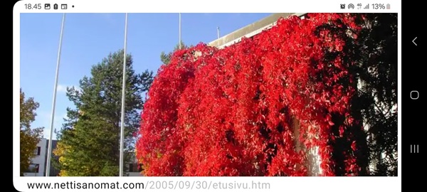 Nettisanomat.com - N:o 3164 - Maanantai 29.9.2025 - Etusivu - Kuvat - Metsän kätkössä. Metsän kätköstä. Metsän kätkössä ja kätköstä. Orava tammenterhojen kimpusssa, hetken, ja sittten jatkaa matkaansa. Uusimaa. Kirkkonummi. Börkdal. Perjantai 26.9.2025 9:52. Kuvat Pertti Manninen. --- Arkisto 2005 - 20 vuotta sitten 30.9.2005. 30.09.2005 perjantaina iltapäivällä. Kuva. "Varjosta valoon". Vanhukset kävelyllä aurinkoisessa syyssäässä. Laukaa. Kuva Pertti Manninen. Sarjasta "Vanhukset". Tulossa! 20 vuotta sitten. 30.09.2005 perjantaina klo 15:25. Kuva. "Punainen kunnantalo eli syksy muuttaa hetkeksi maaseutupitäjän hallinnon väriä luonnonlain voimalla". Pertti Manninen. Laukaa. Sarjasta "Maaseudun elämää". ---------- Nettisanomat.com - N:o 3164 - Maanantai 29.9.2025 - Etusivu - Lukijan kuva. "Perhonen molemmin puolin". Kuvat lähetti Erika N. lauantaina 27.9.2025 20:38 ja 20:42. - Onko ulkopuolella, hieno kuva. - Joo ulkopuolella, et tuo on mahapuoli. - Siitä vaan tunnistamaan! --- Arkisto 2005 - 20 vuotta sitten. Helsingin Sanomat perjantaina 23.09.2005. "Fortumin johdolla päällekkäiset palkkiot". Pääkirjoitus Nettisanomat keskiviikkona 28. syyskuuta 2005. Ajankohta, Fortum, Helsingin Sanomat, ministerit, optiot, psykopaatit, varallisuusveron poisto ja virkamiehet. Aakkosjärjestyksessä toisiinsa kietoutuvaa moskaa. Lue! --- - Arkisto 2005 - Kuvat - 20 vuotta sitten 28.9.2005- 29.9.2005. 28.09.2005 keskiviikkona klo 16:11. Kuva. "Naakat pelmahtavat lentoon matoapajiltaan eilen kynnetyltä pellolta rapsahduksen kuultuaan." Pertti Manninen. Sarjasta Lintuja.Tulossa! 28.09.2005 keskiviikkona klo 16:11. Kuva. "Varikset ja naakat matoapajillaan eilen kynnetyllä pellolla." Pertti Manninen. Sarjasta Lintuja. 28.09.2005 keskiviikkona klo 16:38. Kuva. "Liehuvatukkainen mopotyttö pysähtyy risteyksessä ja jatkaa sitten reippaasti matkaansa". Laukaa. Pertti Manninen. Sarjasta koululaisia. Tulossa! 28.09.2005 keskiviikkona klo 16:38. Kuva. "Pysähdyttyään risteyksessä liehuvatukkainen mopotyttö jatkaa reippaasti matkaansa". Laukaa. Kuva ja tuuli Pertti Manninen. Sarjasta koululaisia. Tulossa! 20 vuotta sitten. Helsingin Sanomat perjantaina 23.09.2005. "Fortumin johdolla päällekkäiset palkkiot". Pääkirjoitus Nettisanomat keskiviikkona 28. syyskuuta 2005. Ajankohta, Fortum, Helsingin Sanomat, ministerit, optiot, psykopaatit, varallisuusveron poisto ja virkamiehet. Aakkosjärjestyksessä toisiinsa kietoutuvaa moskaa. Lue! Les Enfants TERRIBLES ---------- Nettisanomat.com - N:o 3162 - Perjantai 27.9.2025 - Etusivu - Kuvat - Ylen uutiset-uutisissa köyhyydestä keskiviikkona 24.9.2025. ...voivat jäädä syvälle ihmiseen ja tulla osaksi persoonaa. Yle.fi Puolustusministeriön sivuille tehty palveluksenestohyökkäys ohi. Tutkijoita huolettaa myös se, riittäkö leikkausten myötä - vähävaraisilla perheillä rahaa hyvään ravintoon ja kunnon vaatteisiin. Lapset tietävät, jos perheellä on niukkaa. esimerkiksi että jääkaapissa ei ole riittävästi ruokaa. Voi olla hyvinvoinnin kokemuksissa puutteita. Erityisen merkityksellinen lapsilla on sosiaaliset suhteet. Miten se köyhyys vaikuttaa siihen, voivatko he osallistua erilaisiin juttuihin ikätovereiden kanssa? Yle.fi Nuorisojoukko heitti limupullooon tehdyn pommin leikkipuistoon Heinolassa. THL:n mukaan psykiatrian sairaalapaikkoja on liian vähän, Jyväskylässä on jouduttu turvautumaan hätäratkaisuihin. Ylen uutiset-uutisissa köyhyydestä keskiviikkona 24.9.2025. Katso myös! Ylen tv nytt-uutisissa köyhyydestä keskiviikkona 24.9.2025 täällä. Mukana ministeri Sanni Grahn-Laasonen, puheenjohtaja Minja Koskela sekä asiantuntija Aino Sarkia Pelastakaa Lapset ry:stä, joka on myös tässä yläkuvissa. Kuvat. "Kaikki mikä hetkeen tarttui". Pertti Manninen. - Arkisto 2005 -- - 20 vuotta sitten 25.9.2005- 27.9.2005. 25.09.2005 sunnuntaina klo 12:56. Kuva. "Musta lintu lähellä". Siinä ne lentelivät ees taas kiitävällä vauhdilla välillä sekunniksi pariksi oksalle poiketen. Tähtäys ja kuva, välillä myöhässä ja kerran pari ajoissa! Sarjasta Lintuja. Pertti Manninen. 25.09.2005 sunnuntaina klo 12:57. Kuva. "Musta lintu oksalla". Sarjasta Lintuja. Pertti Manninen. 26.09.2005 maanantaina klo 15:50. Kuva. "Ruska loistaa kaikissa väreissä." Laukaa. Pääkirjaston istutuksia. Pertti Manninen. Sarjasta Ruska. Tulossa! 26.09.2005 maanantaina klo 15:16. Kuva. "YIT - yksin itse taivallan." Uudisrakennuksen työmaaparakkien ohikulkijat ajatuksissaan. Laukaa. Pertti Manninen . Sarjasta ihmisiä askareissaan. Tulossa! 27.09.2005 tiistaina klo 12:32. Kuva. "Ruska ruskistaa nuoret koivut." Fasaanien ja muiden lintujen turvapaikka väistyy pikkuhiljaa rakentajien tullessa, onneksi kuitenkin talvea vasten. Poikaset ovat jo isoja. Laukaa. Pertti Manninen. Sarjasta Ruska. Tulossa. 27.09.2005 tiistaina klo 20:06. Kuva. "Köyhyys ja ankeus, onneksi ilma on kuitenkin tänään harvinaisen lämmin". Köyhä ihminen kaivelee kaupan roskalaatikkoa etsien jotakin suuhun pantavaa. Kuvan toinen nimi: "Roskisdyykkari". Pertti Manninen. Sarjasta köyhiä ihmisiä. Tulossa! "Bring my son HOME NOW" "Sota pelottaa amerikkalaisvanhempia. Rauhanmielenosoitus: Presidentin politiikan vastustus kokosi Washingtoniin yli satatuhatta ihmistä." Otsikko. "Ann Bean kertoo valvovansa joka yö odottaessaan uutisia kolmatta kertaa Irakissa palvelevasta pojastaan Aronista. - Odotus on kauheata, haluan hänet takaisin kotiin, Bean rukoilee." Kuvateksti. Keskisuomalainen maanantaina 26.09.2005. Mika Horelli. (8 palstaa ylhäällä). Tulossa! Lue! "Irakin sodan vastustajat osoittivat mieltään. Lontoo. Lontoon keskustaan kooontui lauantaina useita tuhansia mielenosoittajia, jotka vaativat sotatoimien lopettamista Irakissa ja brittijoukkojen nopeaa kotiuttamista. Myös Roomassa, Pariisissa, Madridissa, Kööpenhaminassa ja Washingtonissa järjestettiin vastaavia sodanvastaisia mielenilmauksia. AP". Otsikko ja juttu. Helsingin 