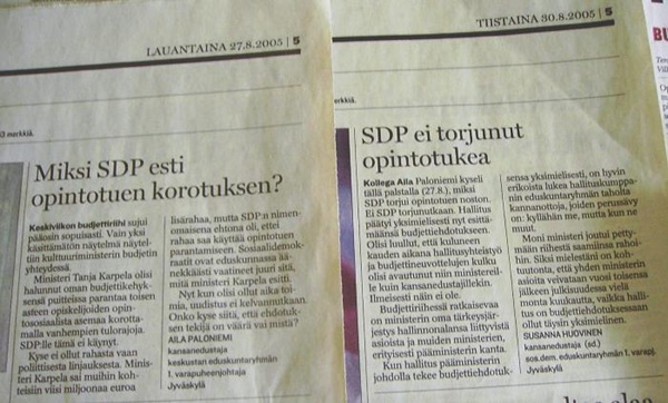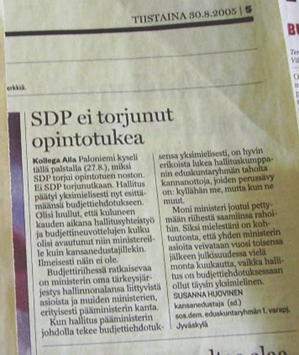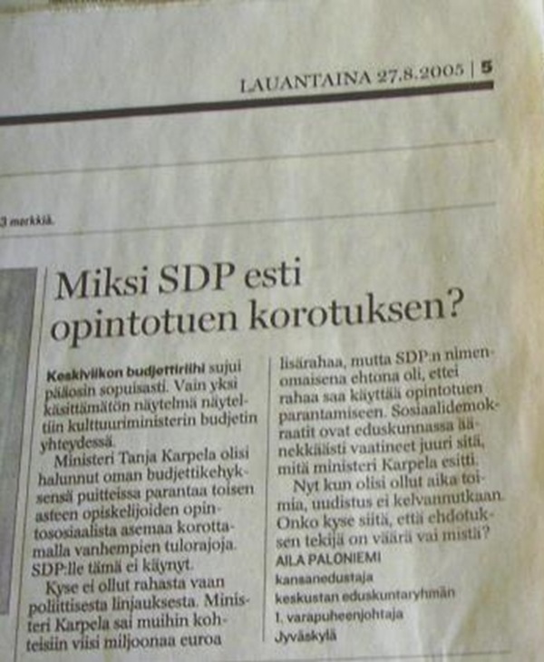 Pääkirjoitus. Miten meitä hallitaan? Tapaus Tanja Karpela ja opintotuki. Mikä on totuus? Pääkirjoitus. Ajankohta, Fortum, Helsingin Sanomat, ministerit, optiot, psykopaatit, varallisuusveron poisto ja virkamiehet. Aakkosjärjestyksessä toisiinsa kietoutuvaa moskaa. "Miksi Helsingin Sanomat valitsi juuri tämän ajankohdan Fortumin johtajien optioiden massiiviselle julkituonnille? Asia on ollut jo pitkään tiedossa, siitä on hiukan kerrottu, mutta nyt sitten rävähti. Jääkö budjetissa esitetty varallisuusveron poisto tämän metelin jalkoihin. Veron poisto on vielä häikäilemättömämpi operaatio. Pääkirjoitus keskiviikkona 28.09.2005. |
