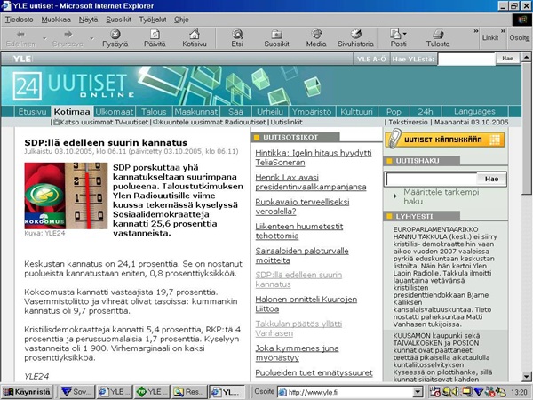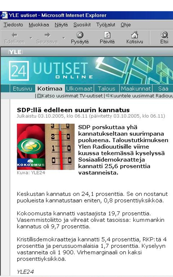 20 vuotta sitten. Yle 24 uutiset aliarvioi katselijoitaan ja kuulijoitaan. Epä-älyllinen gallupin selostus jättää virhemarginaalit huomioonottamatta! Pääkirjoitus tiistaina 04.10.2005. Lue! |