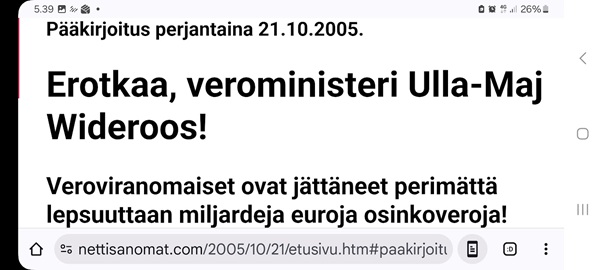 Lue myös! Erotkaa, veroministeri Ulla-Maj Wideroos! Veroviranomaiset ovat jättäneet perimättä lepsuuttaan miljardeja euroja osinkoveroja!Pääkirjoitus perjantaina 21.10.2005.