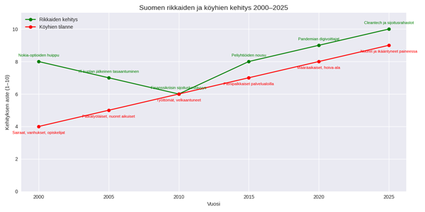 📖 Selittävä teksti graafin rinnalleGraafi kuvaa Suomen rikkaiden ja köyhien kehitystä vuosina 2000–2025 kahdella rinnakkaisella käyrällä.