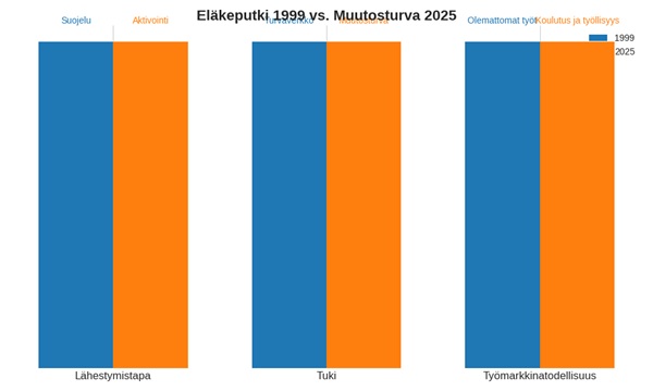 Suomalaisen sosiaalipolitiikan maisema on muuttunut kahdessa vuosikymmenessä tavalla, joka paljastaa yhteiskunnan syvemmät arvovalinnat. Vuosituhannen vaihteessa eläkeputki nähtiin turvaverkkona: se oli väylä, joka suojasi ikääntyneitä työttömiä tilanteessa, jossa työmarkkinat eivät enää tarjonneet realistisia mahdollisuuksia. Kansaneläkelaitoksen tutkija Mikko Viitasen vuonna 1999 Helsingin Sanomien Vieraskynä-palstalla julkaistu kirjoitus tiivisti ajan hengen: “Ei heikennetä työttömyys-eläkeputkessa olevien asemaa pakottamalla heitä etsimään olemattomia töitä.” Nettisanomat julkaisi tämän otsikon 5.8.1999. Tuolloin retoriikka oli selvä: suojelu ennen aktivointia. Eläkeputki ei ollut valinta, vaan pakon sanelema turva. Se kertoi yhteiskunnan vastuusta niille, jotka olivat tehneet pitkän työuran mutta jääneet työmarkkinoiden ulkopuolelle. Vuonna 2025 tilanne on toinen. Eläkeputki on poistettu, ja sen tilalle on tullut muutosturvamalli, joka painottaa uudelleenkoulutusta, työllistymistä ja aktiivisia toimia. Retoriikka on kääntynyt: aktivointi ennen suojelua. Ikääntyneille tarjotaan koulutusta ja tukea, mutta samalla eläkeikä on noussut, ja turvaverkko on muuttunut ehdolliseksi. �� Kaavio: “Eläkeputki 1999 vs. Muutosturva 2025” (Vasemmalla sininen: suojelu, turvaverkko, olemattomat työt. Oikealla oranssi: aktivointi, muutosturva, koulutus ja työllisyys.)