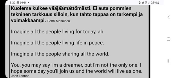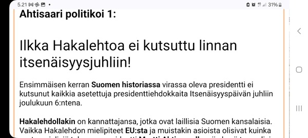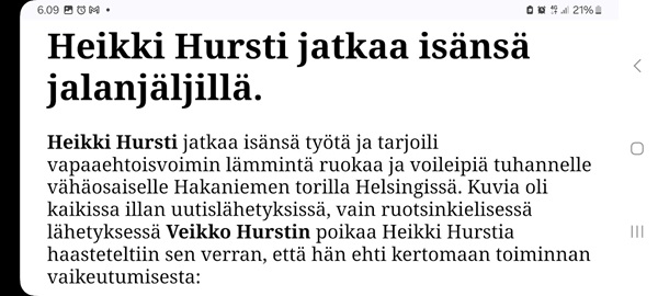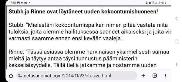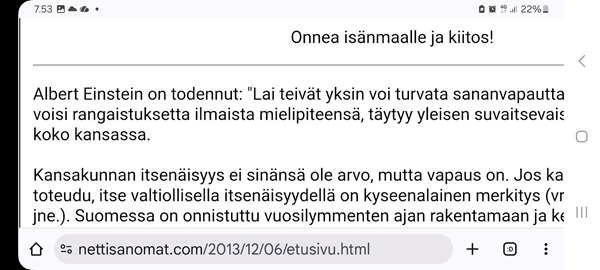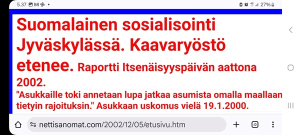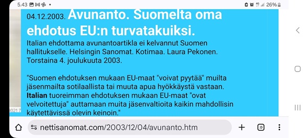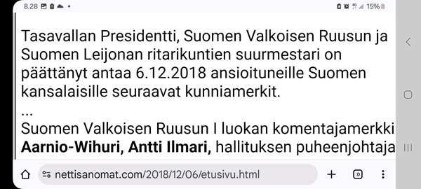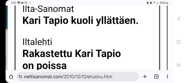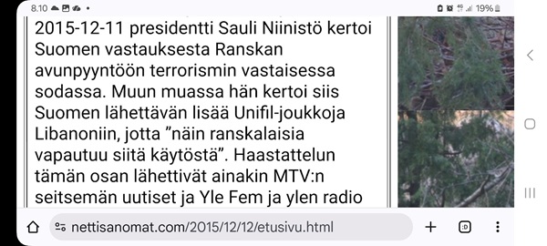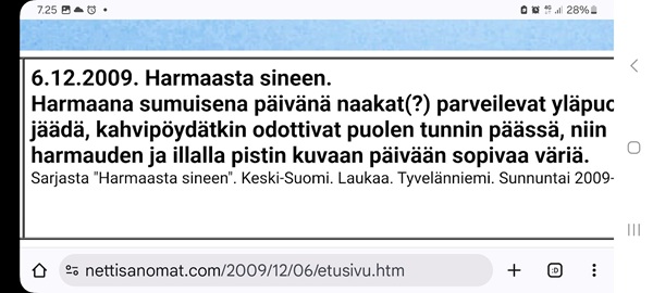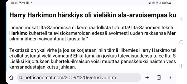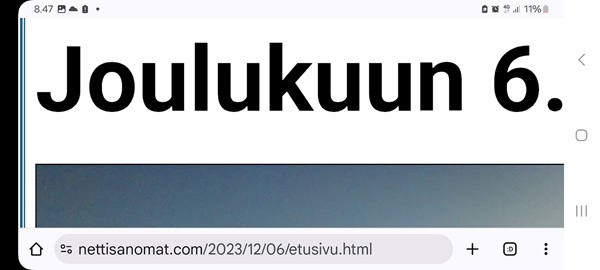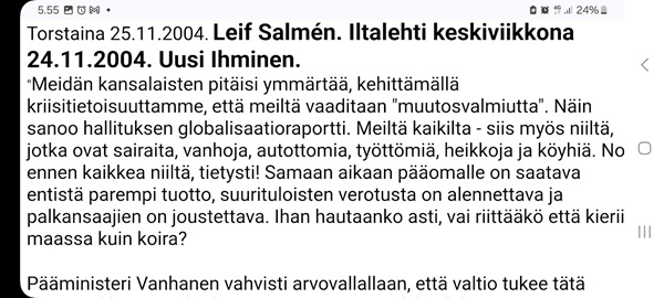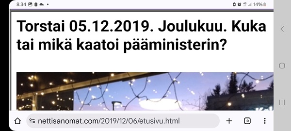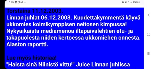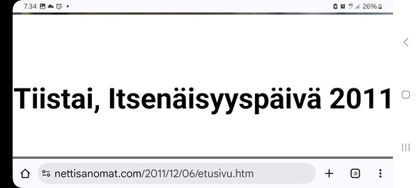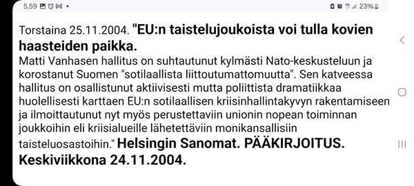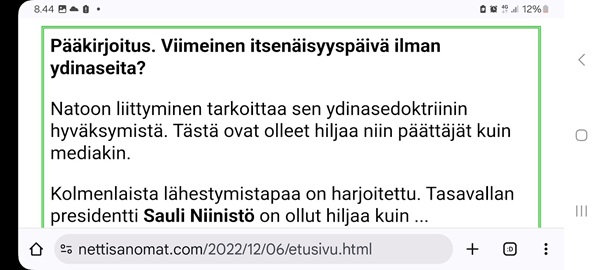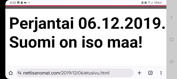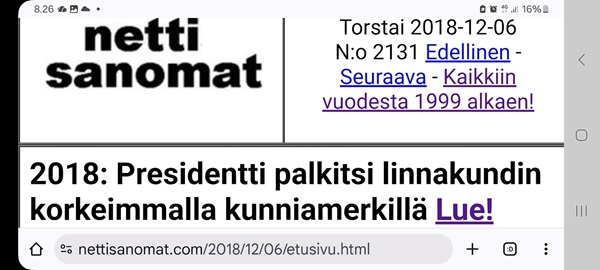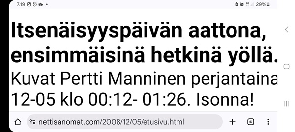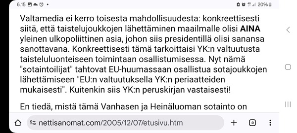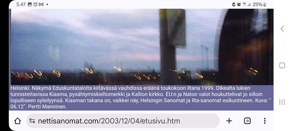 Nettisanomat.com - N:o 3218 - Sunnuntai 7.12.2025 - Etusivu - Kuva - Tasan 6.12. Kuvakaappaus 7.12 8:38 Turun Sanomat Suomi juhlii itsenäisyyspäivää Kuvagalleria Linnan juhlien tunnelmat: Robin juhli kihlattunsa kanssa, Daniel Ståhl otti mukaansa tukulaistaustaisen äitinsä. Jutta Virtanen teki linnan juhliin puvun, joka muistuttaa naisen sukuelintä. ----------- -- Nettisanomat.com - N:o 3217 - Lauantai 6.12.2025 - Etusivu - Kuva - Orava vauhdissa omassa puussaan. Uusimaa. Kirkkonummi. Kauhala. Björkdal. Perjantai 5.12.2025 13:11. Kuva Pertti Manninen ruudun takaa. - - Itsenäisyyspäivän juhlat 2025 n. 6.12 Kyllä itsenäisyyspäivää pitää juhlia ja kunnioittaa itsenäisyyspäivänä 6.12 eikä noin 6.12 ... -2000 vs. 2025. Pääkirjoitus: 1999 vs. 2025 – Hurskastelun aika ei ole ohi Lue! -TÄ-Claudelle: Analysoi kirjoitukset Nettisanomista 1999. Rinnasta ne nykypäivään 2025, tee pääkirjoitus ja laita otsikkoon myös "2000 vs. 2025". Olen analysoinut Nettisanomien vuoden 1999 kirjoituksia ja rinnastanut ne vuoteen 2025. Pääkirjoitus on nyt valmis. Pääkirjoitus: 2000 vs. 2025 – Hurskastelun aika ei ole ohi Kun historian ääni kajahtaa läpi vuosikymmenten - Selatessani Nettisanomien vuoden 1999 arkistoja törmäsin hätkähdyttävään totuuteen: 26 vuotta sitten esitetyt syytökset ja kritiikki kaikuvat kuin kaiku jonka aika on pysäyttänyt, mutta jota historian pyörä pyörittää yhä uudelleen. Vuonna 1999 ministeri Maija Perho ja Helsingin Sanomat "hurskastelivat" nuorten työttömien kustannuksella. Professori Jaakko Pehkonen vaati, että "jos työtön ei löydä työpaikkaa hän menettää ansioturvansa" – vaikkei työpaikkoja ollut tarjolla. Tuolloin romutettiin Lex Leppänen, laki joka velvoitti kunnat työllistämään nuoret. Pertti Mannisen Nettisanomat kysyi terävästi: "Pankinomistajientukeako tässäkin maksetaan?" Mitä on muuttunut?- "N. 6.12" vuosien varrelta 2012- 2024, Niinistön ja Stubbin. Kuvakavalkadi. Katso! -- --------------------- Nettisanomat.com - N:o 3216 - Perjantai 5.12.2025 - Etusivu - Kuvat - Naakkoja hetken. Vaikka hyvä apaja on käsillä, niin joku antaa merkin ja sitten lähdetään lentoon. Uusimaa, Kirkkonummi. Keskusta. Asema. Torstai 4.12.2025 14:12. Kuvat Pertti Manninen hidastaen. - Kuvakavalkadi - "N. 6.12" vuosien varrelta 1999- 2011, Ahtisaaren ja Halosen aikaan. Kuvakavalkadi. Katso! -2000 vs 2025. Nato ei tee virhearvioita 🔥 Vuosituhannen vaihteen ääni Nato nähtiin kylmänä koneistona: "tuhota, tuhota ja taas tuhota." Koiviston päätös Irakin pommituksista painoi moraalisesti raskaana. Balkanin sodan varjossa pelättiin: "Tahdotko poikasi Balkanille tapettavaksi?" Ministeri Enestam symboloi eliittiä, joka päättää muiden puolesta mutta ei itse kanna rintamavastuuta. ------------- Nettisanomat.com - N:o 3215 - Torstai 4.12.2025 - Etusivu - Kuvat - Juhlat alkavat - epäoikeuden- mukaiseen rauhaan - seuraavasta kohteesta - helppo Näin selostaja varautuu Linnan juhliin - Linnan juhlat alkavat jo aikaisin - Ristikot - Helppo - Joulu kotiin ja sydämeen - Traktorilla tavataan - Keskiyön kauhut - Joulun - Stubb MTV:lle - Täytyy varautua epäoikeudenmukaiseen rauhaan - Tuttavat voivat vaikuttaa elinikään - Venäjä ei tyydy Ukrainaan - Selvä näkemys seuraavasta kohteesta - Helppo muutos nukkumisessa laskee verenpainetta. Uusimaa Kirkkonummi. Keskusta. Prisma. Torstai 4.12.2025 Keskiviikko 3.12.2025 11:08. Kuvat Pertti Manninen paikalleen jähmettyneenä. - - 2000 vs 2025. Urheilijan valinta & olosuhteet. “Suomalainen on helteessä hötöä!” – Nettisanomat, 25.8.1999 Vuonna 1999 julkaistu urheilukirjoitus Nettisanomissa oli suorasukainen ja filosofisesti virittynyt puheenvuoro urheilun valintakriteereistä. Se kyseenalaisti Suomen Urheiluliiton teknisen lähestymistavan ja nosti esiin psykologisen ja filosofisen ulottuvuuden: kuka edustaa, miksi, ja millaisissa olosuhteissa? Kirjoitus kiteytti kansallisen kokemuksen Sevillan helteessä: suomalainen urheilija ei ole geneettisesti kotonaan paahtavassa pätsissä. Valinta arvokisoihin ei ollut vain tulosrajojen ylittämistä, vaan identiteetin, olosuhteiden ja inhimillisen rajan tunnistamista. - ---------- Nettisanomat.com - N:o 3214 - Keskiviikko 3.12.2025 - Etusivu - Kuvat - Uusi lintulauta korkeammalle, minne peurat eivät yllä. Uusimaa Kirkkonummi. Kauhala. Björkdal. Keskiviikko 3.12.2025 13:08. Kuvat Pertti Manninen ruudun takaa. - Pääkirjoitus - Itsenäisyyspäivän juhlat 2025 n. 6.12 Kyllä itsenäisyyspäivää pitää juhlia ja kunnioittaa itsenäisyyspäivänä 6.12 eikä noin 6.12 Presidentti Stubb on nyt tehnyt päätöksen, että elossa oleville veteraaneille ja lotille järjestetään juhlat 4 päivää aikaisemmin 2.12.2025. Tämä on loukkaus elossa oleville veteraaneille ja lotille niinkuin myös jo täältä poistuneille. Ajattelen veteraanin poikana niin, että kun isäni joutui Lapin sotaan viimeisenä ikäluokkana 1910-syntyneet ja nuoremmat, vanhemmat pääsivät kotiutukseen. Isäni palasi Lapista hengissä, mutta monet siellä kaatuivat. Kyllä vielä neljä päivää ennen sodan loppumista kuoli monia nuoria miehiä. Ei se voi mennä niin, että näiden neljän viimeisen päivä kuolleita ei laskettaisi mukaan niihin jotka antoivat henkensä Suomen puolesta. Tällainen noin 6.12 -ajattelu ei kunnioita heitä kaikkia ja kyllä ihmettelen että veteraaneille ja lotilla pyyhitään pöytää itsenäisyyspäivän 6.12 juhlinnassa. Pääkirjoitus. Pertti Manninen. Keskiviikkona 3.12.2025 15:07. Kirjoitus julkaistu täysin samanlaisena vuosi sitten vain vuosiluku muuttaen. - - Kuvat - Maistuu minullekin. Peurakin on löytänyt lintujen ruokintapaikalle siemeniä ja pähkinöita mutustelemaan nyt taas ihan lumettomassa maassa. Uusimaa. Kirkkonummi. Kauhala. Björkdal. Lauantai 29.11.2025 11:49. Kuvat Pertti Manninen hetkellä jolloin molemmat töllistelivät toisiaan. -2000 vs 2025. Laajavuoren rallirata ja kaupunkikehit