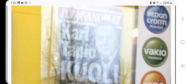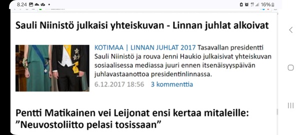Näin selostaja varautuu Linnan juhliin - Linnan juhlat alkavat jo aikaisin - Ristikot - Helppo - Joulu kotiin ja sydämeen - Traktorilla tavataan - Keskiyön kauhut - Joulun - Stubb MTV:lle - Täytyy varautua epäoikeudenmukaiseen rauhaan - Tuttavat voivat vaikuttaa elinikään - Venäjä ei tyydy Ukrainaan - Selvä näkemys seuraavasta kohteesta - Helppo muutos nukkumisessa laskee verenpainetta. Uusimaa Kirkkonummi. Keskusta. Prisma. Torstai 4.12.2025 Keskiviikko 3.12.2025 11:08. Kuvat Pertti Manninen paikalleen jähmettyneenä. |