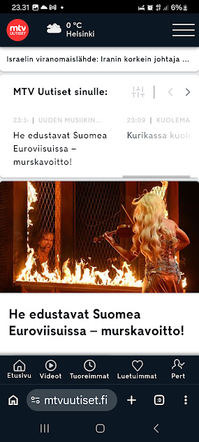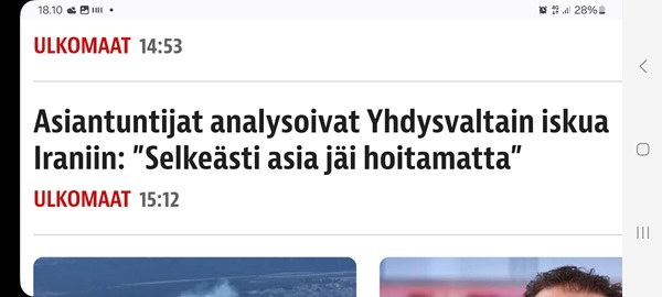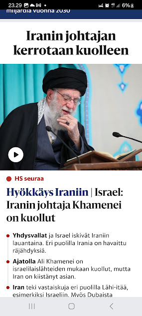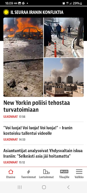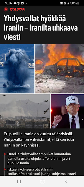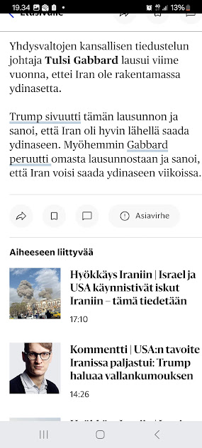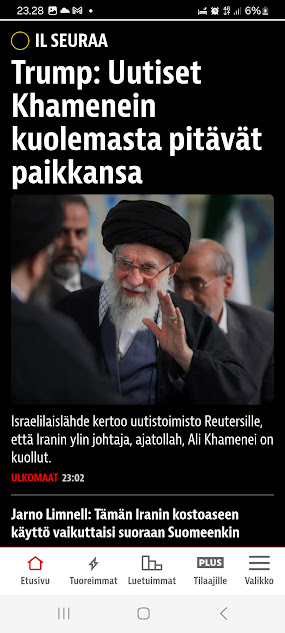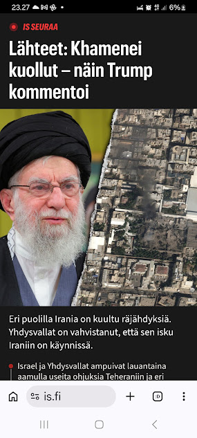 Nettisanomat.com - N:o 3303 - Maanantai 2.3.2026 - Etusivu - Kuva - Hiljentykää, keskittykää, NYT! Kuva. Yleisurheilun halli-SM. Espoo. Naiset 60 m välierät. Kuvia Ylen lähetyksestä Pertti Manninen lauantaina 28.2.2026. - - Virve, Virva, Fanni, Fiona. - Fanny, Fiona. - Virvá. - Suomen saamelaiskäräjien perustamispäivä. Päivä on saamelaisten liputuspäivä. Saamelaisten lipussa on punaista, vihreää, keltaista ja sinistä. "Pohjoisessa on ankarat pakkaset". Yksi kuva 57:stä. Kuva julkaistu ensimmäisen kerran 12.2.2012. -- Päiväkirja jatkuu 18:07-18:10 IS Yhdysvallat hyökkää Iraniin - Iranilta uhkaava viesti. IL New Yorkin poliisi tehostaa turvatoimiaan. IL Asiantuntijat analysoivat Yhdysvaltain iskua Iraniin: "Selkeästi asia jäi hoitamatta". Kuvakopiot Pertti Manninen lauantaina 28.2.2026 illalla kuuden jälkeen! 18:22-18:29 Kuvat. Yleisurheilun halli-SM. Espoo. Naiset 60 m välierät. Kuvat Ylen lähetyksestä Pertti Manninen lauantaina 28.2.2026. - Valio - Finsoffat 19:33 "Perusteluita Iranin ydinaseista Dahlgren pitää savuverhona." ... "Yhdysvaltain kansallisen tiedustelun johtaja Tulsi Gabbard lausui viime vuonna, ettei Iran ole rakentamassa ydinasetta." Trump sivuutti tämä lausunnon ja sanoi, että Iran oli hyvin lähellä saada ydinaseen. Myöhemmin Gabbard peruutti omasta lausunnostaan ja sanoi, että Iran vpoisi saada ydinaseen viikoissa." Hs.fi/politiikka 22:20 "Elämä on karkkii". S-kaupan uutuuskarkit eivät jätä rauhaan! MTV3 lauantaina 28.2.2026 22:20. Kuva ruudusta Pertti Manninen. Lue myös! Kuva. Elämä on liikalihavuutta ja huonoja hampaita. S-Business. Lue! Elämä on karkkii. S Market. Kuva MTV3:n lähetyksestä lauantaina 21.2.2026 19:09 toistoja pitkin iltaa ihmetellen Pertti Manninen. Pääkirjoitus: Karkkihyllyn pituinen vastuu. Lue! 23:27-23:32 IS Lähteet Khameini kuollut - Näin Trump kommentoi. IL Trump: Uutiset Khameinin kuolemasta pitävät paikkansa. HS Iranin johtajan kerrotaan kuolleen. Yle Linda Lampenius ja Pete Parkkonen voittivat UMK:n. MTV uutiset He edustavat Suomea Euroviisuissa - murskavoitto! Keskisuomalainen Linda Lampenius ja Pete Parkkonen murskavoittoon UMK:ssa! Kuvakopiot Pertti Manninen lauantaina 28.2.2026 keskellä yötä! Osa1 - Osa2 - Osa3 - ---------- Nettisanomat.com - N:o 3302 - Sunnuntai 1.3.2026 - Etusivu - Kuva -"Pöllö lumessa". Hiihdon maailmancup. Sprintit. Falun Ruotsi. Kuvat Ylen lähetyksestä Pertti Manninen Lauantaina 28.2.2026 17:59. - Alpo, Alpi, Alvi. - Albin. - Álbe. - Maailman meriheinäpäivä (YK). Syrjinnän vastainen päivä (YK) - - Päiväkirja jatkuu 15:53- 15:59 Viikon mielenkiintoisimmat keskustelut. Vieraat kertovat oivalluksistaan ja kokemuksisaan faktojen ja huumorin kera Eva Kelan ja Janne Grönroosin johdolla. "Brita Stenius-Aarniala oli sotalapsi." Kuvat Ylen lähetyksestä Pertti Manninen. https://areena.yle.fi/1-76370128 Mv-kuvat: sotalapset.fi. - miten paljon lapset joutuivat kärsimään, - ja jotka kotiinpalatessaan olivat unohtaneet suomenkielen. - Muistatko ikävöineesi kotiin Suomeen? - Aselepo saatiin 1944. - Miten sotalapsiaika on vaikuttanut heihin aikuisiässä? - Onko vaikutuksissa yhteisiä piirteitä? - Menen aina ulos kannelle, jos vain voin. Brita Stenius-Aarniala, läkare 17:11-17:59 Kuvat. Hiihdon maailmancup. Sprintit. Falun Ruotsi. Kuvat Ylen lähetyksestä Pertti Manninen. - Heja Sverige - World Cup Falun Swe. Foto finish, Women sprint free. www.fis-app.com - coop Falun 2027. - coop coop coop coop coop coop coop ... JATKUU - ----------- Nettisanomat.com - N:o 3301 - Lauantai 28.2.2026 - Etusivu - Kuva - "Kirjaston tytöt". Kalevalan päivänä, suomalaisen kulttuurin päivänä. Keski-Suomi. Jyväskylä. Vaajakoski. Torstai 2013-02-28. Kuva: Pertti Manninen. Laajenna! - -Onni, Sisu. - Runa, Rune. - Curtnaa. - Kalevalan päivä, suomalaisen kulttuurin päivä. - Päiväkirja. 10:31 Henri: Tiedätkö mikä liputuspäivä on tänään? 10:31 Sinä: Aina ajan tasalla , joka vuosi! 10:41 Henri: Miten sen ottaa, perjantai 28.2.? (Hymy) 10:45 Ai se oli viime vuodelta 10:46 Sinä: (Hymy) 10:46 12:39 Arkistointia, joka ulottuu vuodesta 1999 nykypäivään. Claude (Antropic) 28.2.2026 12:18 12:22, 12:24, 12:28 12:30 12:32, 12:35 Yhdysvallat hyökkää Iraniin räjähdyksiä ympäri Lähi-Itää Yhdysvallat ja Israel iskivät Iraniin Räjähdyksiä kuultu ympäri Lähi-Itää Yhdysvallat iski Iraniin räjähdyksiä on kuultu useissa kaupungeissa USA ja Israel iskivät Iraniin Hyökkäys Iraniin Islamilaisen vallankumous-kaartin johtoa kuoli iskussa, myös Khamenei kohteena Yhdysvallat ja Israel hyökkäsivät Iraniin, vastaiskuja USA:n useisiin liittolaismaihin Lähi-Idässä MTV seuraa UM: Iranissa 70 suomalaista heitä ei olla evakuoimassa Yhdysvaltain iskut voivat nostaa Bensan hintaa Suomessa myös osakemarkkinat saattavat hetkelllisesti säikähtää Trump vahvisti Yhdysvaltojen iskeneen Iraniin tavoitteena eliminoida Iranin hallinnon aiheuttamat "välittömät uhat" IS seuraa. IL seuraa. Yle Live. HS seuraa. MTV seuraa. Keskisuomalainen Uutissuomalainen. 28.2.2026. JATKUU - --------- Nettisanomat.com - N:o 3300 - Perjantai 27.2.2026 - Etusivu - Kuvat - Tervetuloa Välkommen Torstain lööpit. Ilta-Sanomat. Näin paljon vastinetta saat ekäkemaksuillesi. Trumpin uhmakas puhe. Iltalehti. Asuinpaikka vaikuttaa karusti terveyteen Voi aiheuttaa jopa sydänongelmia Tästä Jasmine ei pidä Hjalliksen luksuskodissa. -- Tervetuloa Välkommen - Torstain lööpit. Ilta-Sanomat. Näin paljon vastinetta saat ekäkemaksuillesi. Trumpin uhmakas puhe. Iltalehti. Asuinpaikka vaikuttaa karusti terveyteen Voi aiheuttaa jopa sydänongelmia Tästä Jasmine ei pidä Hjalliksen luksuskodissa. -- Torsti. - Torsten. - Dorste. ----------- Nettisanomat.com - N:o 3299 - Torstai 26.2.2026 - Etusivu - Kuvat -Sotaan, lähdemme sotaan! Lähdemme sotaan, kaikilla Jumalan lapsilla on aseita. - Lähdemme sotaan, kaikilla Jumalan lapsilla on aseita. Elokuvakerho Toveruuden Neljä naurett