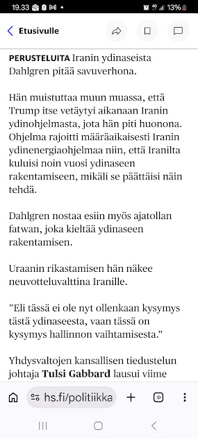 19:33 "Perusteluita Iranin ydinaseista Dahlgren pitää savuverhona." |