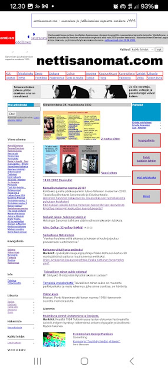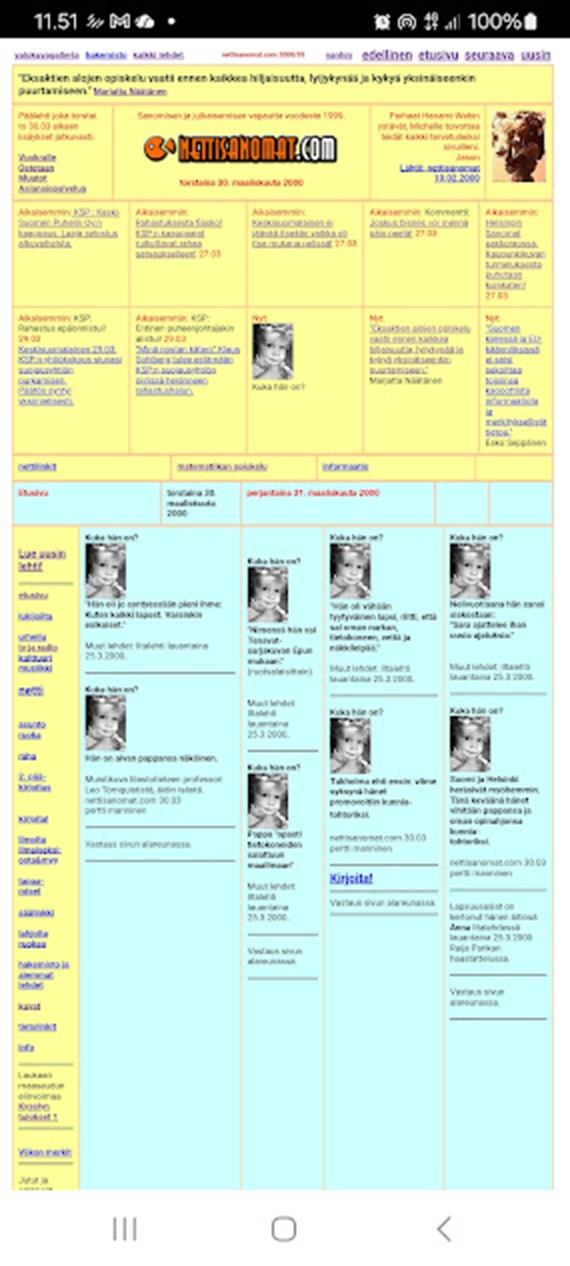 https://www.nettisanomat.com/2003/03/27/etusivu.htm Erinomainen numero — erittäin rikas. Etusivu on poikkeuksellisen täydellinen; kaikki keskeiset tekstit ovat suoraan sivulla. Kokoan analyysin. Nettisanomat 2003/191 —
