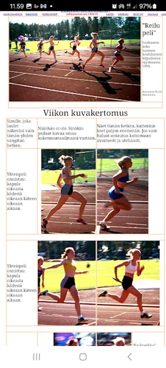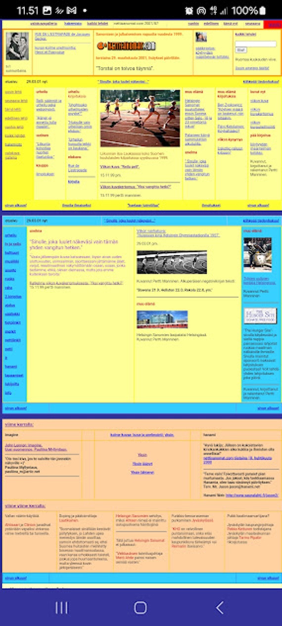 Minulla on nyt riittävästi etusivun sisältö suoraan haetusta HTML:stä. Alasivujen sisältö on osin suojattu suorilta hauilta, mutta etusivulta löytyy kaikki juttujen otsikot, ingressit ja rakenne selvästi. Kootaan analyysi siitä, mitä on saatavilla. Nettisanomat 2001/87 — torstai 29. maaliskuuta 2001INGRESSINumero 87 (29.3.2001) on rakenteeltaan kolmihaarainen: urheilu, mediakritiikki ja sosiaalipolitiikka. Lehti kokoaa yhteen rallin sääntökiistat, Helsingin Sanomien tavan "puukottaa" kilpailijoita nimettömillä lähteillä sekä Ben Zyskowiczin ja Päivi Ketolaisen välisen köyhyyskeskustelun. Sivuston tunnelma on analyyttinen mutta terävä — nettisanomat asettaa itsensä selvästi vartiovuoroon niitä vastaan, jotka määrittelevät totuuden omiin intresseihinsä sopivaksi. Numeron visuaalinen ja tunnelmallinen vastapiste on ranskalainen elokuva ja Pertti Mannisen valokuvaus: "Rue de l'Estrapade" ja Olympiastadionin 1957 kilpakuva tarjoavat hengähdystauon. PÄÄKIRJOITUSKöyhyyden määritelmän kritiikki Pääkirjoituksen lähtölaukaus on Ben Zyskowiczin väite, jonka mukaan köyhien määrä on laskenut, niin pitääkin. Nettisanomat Tähän nettisanomat vastaa Päivi Ketolaisen kysymyksellä: "Köyhättääkö?" — ja rakentaa oman kritiikkinsä absoluuttisen ja suhteellisen köyhyyden käsitteiden erottelun ympärille. Suhteellisesti köyhän olisi herttaisen yhdentekevää olla köyhä suhteellisesti, kunhan vain pärjäisi edes jotenkin. Nettisanomat Tässä piilee Mannisen argumentin ydin: suhteellisen köyhyyden käsite on poliittinen työkalu, jolla voidaan tehdä todellinen kurjuus näkymättömäksi. Zyskowicz edustaa kantaa, joka mittaa edistystä tilastoilla; nettisanomat kysyy, mitä tilastot piilottavat. ALAKIRJOITUKSET1. Helsingin Sanomat puukottaa: ensin Sonera, sitten Salo. 18 ja 23 nimetöntä iskua. Tämä on numeron mediakriittinen kärki. Nettisanomat laskee systemaattisesti, montako nimetöntä lähdettä Helsingin Sanomat on käyttänyt Soneran ja Salon juttuihin: 18 ja 23 kappaletta. Otsikko "puukottaa" on tietoinen metafora — nimettömät lähteet ovat ase, jota ammattijulkaisu käyttää ilman vastuuta. Kritiikki ei kiistä juttujen asiasisältöä vaan niiden metodia: journalismi, joka rakentaa argumenttinsa yksinomaan nimettömien varaan, antaa toimittajalle ja toimitukselle täyden vallan muotoilla todellisuus haluamakseen. 2. Palaneen käryä sammutettiin alkutulilla. Tämä on jatkoa edelliselle. Otsikko viittaa siihen, että jokin juttu tai kohu on yritetty sammuttaa ennen kuin se ehtii levitä laajemmalle. Asiayhteys viittaa Sonera- tai Salo-juttuihin — "palaneen käry" on jo ilmassa, mutta mediarakenne on hoitanut asian sisäisesti, ennen kuin yleisö ehtii reagoida. 3. Urheilu: Ralli, säännöt ja urheilu sekä vedonlyönti. "Hänen ei annettu tulla maaliin." Rallijuttu käsittelee sääntöjen ja urheilun suhdetta, johon kytketään vedonlyönti — eli taloudellinen intressi, joka voi vääristää tuloksia tai sääntöjen soveltamista. Otsikko "Hänen ei annettu tulla maaliin" vihjaa, että jokin kilpailija tai kilpailu on manipuloitu — sääntöjä on sovellettu epätasaisesti. 4. "Liikunta kohottaa nuorten itsetuntoa." Lyhyempi uutinen, joka tasapainottaa rallin ja mediakritiikin rinnalla terveysjournalismin puolella. 5. Urheilijoiden psyyke — kolme kirjoitusta Numero sisältää kolme urheilu-esseetä: "Unohtuuko urheilijoiden psyyke?", "Huipulle vain urheilijan omin ehdoin" ja "Urheilun huipuilla leikki on kaukana." Nämä muodostavat temaattisen kokonaisuuden: huippu-urheilu vaatii kovan psyykkisen hinnan, ja tätä puolta ei käsitellä riittävästi. 6. Elokuva: Rue de l'Estrapade (Jacques Becker, 1953). TV1 sunnuntaina. Ranskalaisen elokuvan esittely on numeron kulttuurinen henkireikä. Jacques Beckerin kevyt, tarkkasilmäinen pariisilainen elokuva on Pertti Mannisen suosikkilajityypin ytimessä — tarkka ihmistutkielma arkisessa miljöössä. 7. Viikon vanhakuva: "Huippujen kiriä Helsingin Olympiastadionilla 1957." Pertti Mannisen ottama kuva nuoruudestaan. Alkuperäisen negatiivikirjan teksti: "Bowens 21.0, Hellsten 22.0, Rekola 22.0, ym." Kuva kytkeytyy samaan urheiluteemaan — mutta eri rekisterissä: muistona, ei analyysina. 8. Viikon kuvaunelmointi: Henri et Françoise Kolme kuvaa: elokuvasta tai arjesta irrotettuna — "unelmointi". Visuaalinen vastapari tekstille. VIIME NUMEROISTA — RISTIVIITTEETEtusivu kokoaa myös aiempien numeroiden aiheita näkyväksi historiaksi: Numero 15.3.2001: "Matti Ahde painoi naisen seinää vasten" / Helsingin Sanomat selvittää, miksi nimeä ei mainittu / Vallan väärinkäyttöä: Clinton ja Ahtisaari / Pukki kaalimaanvartijana (Jyväskylän kaupunginjohtaja Pekka Kettunen todistajana Tarmo Pipatin jutussa) / Funkkis-bensa-aseman purkaminen Jyväskylässä / Doping ja päätoimittaja Laatikainen. Numero 8.3.2001: Lahden MM-hiihdot 2001 — "Yksitoista päivää urheilua ja dopingia." Numero 22.3.2001: John Lennon: Imagine — uusi suomennos (Pauliina Myllyntaus) / kolme kuvaa: "Yksin", "Yksin jäänyt", "Yksin lähtenyt" / Hanami.