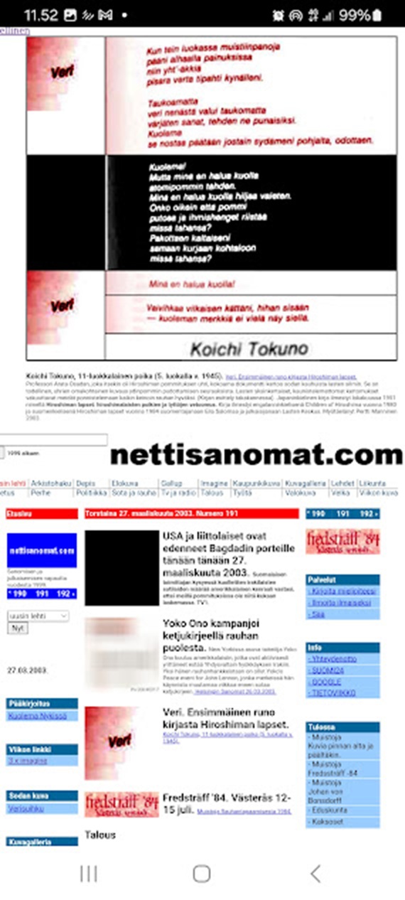 Fetched: nettisanomat.com - 2003/03/27 - etusivu - Veri. Ensimmäinen runo kirjasta Hiroshiman lapset - yomi - leppiniemi - lehto - kokko - joka torstai - kuva - kuvat - pertti manninen - nettisanomat.