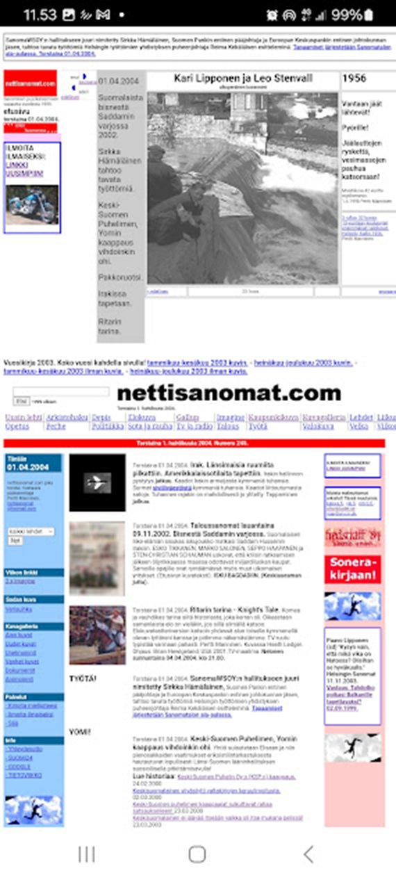 https://www.nettisanomat.com/2004/04/08/etusivu.htm Erinomaisen rikas sivu — numero 246 sisältää kolmen peräkkäisen numeron (243, 245, 246) koko sisällön yhdellä pitkällä etusivulla. Kokoan analyysin. Nettisanomat 2004/246 —