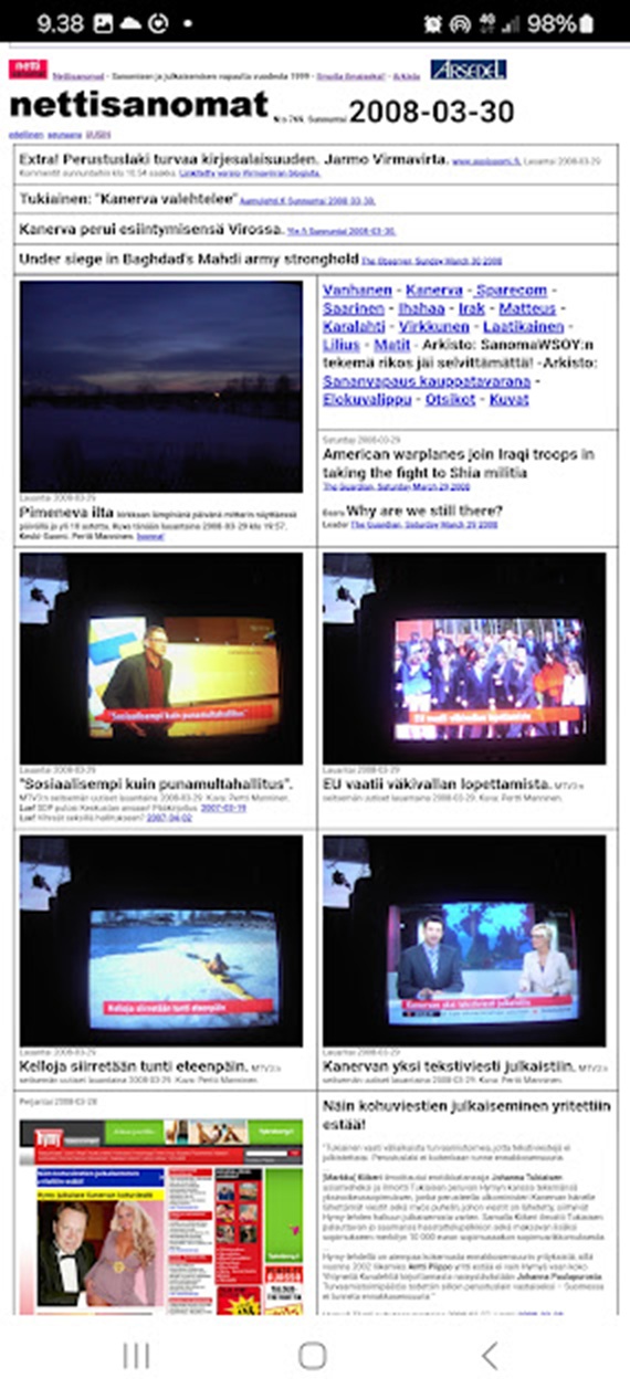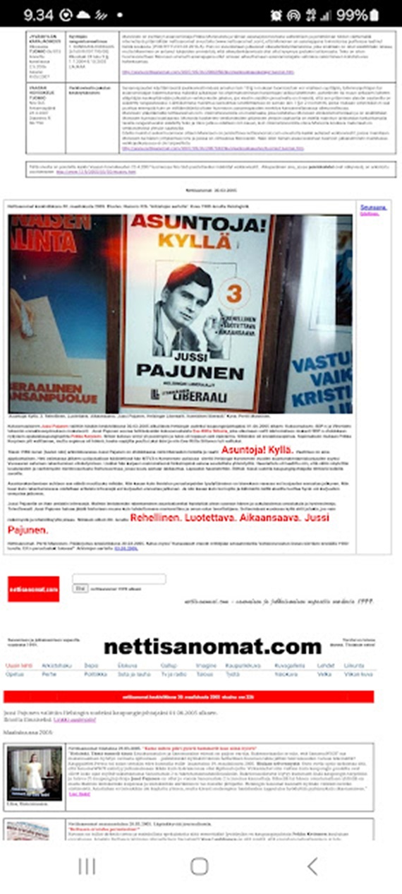 27.3. Fetched: 'nettisanomat Erittäin rikas numero — ja erityisen tärkeä oikeudellisesta syystä: sivulla on näkyvästi esillä Jyväskylän käräjäoikeuden tuomio (2.5.2006) ja Vaasan hovioikeuden tuomio (23.4.2007), sekä merkintä siitä, että alkuperäinen sivu on arkistoitu osoitteeseen www.12.fi. Kokoan analyysin. Nettisanomat 2005/326 — keskiviikko 30. maaliskuuta 2005INGRESSINumero 326 ilmestyi poikkeuksellisesti keskiviikkona — Jussi Pajusen valinta Helsingin kaupunginjohtajaksi samana iltana pakotti julkaisemaan vuorokautta etuajassa. Numero on kuukauden maaliskuun koonti: etusivu toimii koko maaliskuun 2005 arkistona, johon on liitetty päivittäiset lisäykset 3.3.—30.3.2005. Sisällöllisesti numero kietoo yhteen neljä toisiinsa kytkeytyvää teemaa: Helsingin valtasuhteet ja kaupunkikuva (Pajunen, Sanomatalo, Malmin lentokenttä), Pekka Kettusen eroraha Jyväskylässä, Soneran teleurkintajutun ikuinen pimentoon jääminen ja kansainvälinen politiikka (Wolfowitz, Irak). Sivua rasittaa myös oikeudellinen varjo: Pekka Mononen -juttu, josta myöhemmin tuomittiin kunnianloukkauksesta. Oikeudellinen huomio: Sivun alussa on näkyvästi esillä sekä Jyväskylän käräjäoikeuden tuomio 2.5.2006 (kunnianloukkaus) että Vaasan hovioikeuden tuomio 23.4.2007, joka määräsi poistamaan Monoseen viittaavat verkkoviestit nettisanomat.com-sivustolta. Alkuperäinen sivu — poistokohdat näkyvinä — on arkistoitu osoitteeseen www.12.fi/2005/03/30/etusivu.htm. PÄÄKIRJOITUSJussi Pajunen — "Asuntoja! Kyllä. Rehellinen. Luotettava. Aikaansaava." Päätoimittajan kirjoitus on päivätty 30.3.2005. Lähtökohtana on 1980-luvun arkistokuva, jossa nuori Jussi Pajunen kampanjoi liberaalien listalla Helsingissä vaatien asuntoja. Sama vaatimus — asuntoja — on edelleen ajankohtainen 20 vuotta myöhemmin. Manninen analysoi Pajusen valinnan rakennetta: kokoomuslainen Pajunen seuraa kokoomuslaista Eva-Riitta Siitosta, joka aikoinaan voitti äärimmäisen niukasti SDP:n ehdokkaan Pekka Korpisen. Silloinkin oli ennakkosopimus — mutta sopimus oli hölmö, koska sopijilta puuttui yksi ääni. Nyt sopimus piti. Pajusen ensimmäisessä MTV3-haastattelussa kymmenen vuoden asuntorakentamiskurjuuden syyksi vieritettiin Vuosaaren sataman rakentamisen viivästyminen. Manninen kirjoittaa suoraan: niin kauan kuin ihmisten perustarpeiden tyydyttäminen on bisneksen varassa, niin kauan kuin rakentamisessa voidellaan erilaisia intressejä ja korruptio tuottaa hyvin — kurjuuden voi ennustaa jatkuvan. Sitten terävä henkilökohtaistus: Jussi Pajusella on ihan omiakin intressejä. Malmin lentokentän rakentaminen asuntoalueeksi hyödyttää aivan suoraan hänen ja sukulaistensa omistuksia. Helsingin Sanomat kannatti kylmän viileästi kentän siirtämistä. Sanomatalo 2 -hanke kytkeytyy samaan verkostoon: tuleva kaupunginjohtaja on ollut jo vuosia innokas Sanomatalo 2:n kannattaja. Asioita ei tietenkään ole koplattu yhteen, mutta kivasti molempien hankkeiden lopputulos hyödyttää pyrkimyksiä rikastumiseen. Loppu on rehellinen: "Toivottavasti Jussi Pajunen haluaa jäädä historiaan muuna kuin tahdottomana marionettina ja oman edun tavoittelijana. Seitsemässä vuodessa kyllä ehtii jotakin, jos vain näkemystä ja inhimillisyyttä piisaa." ALAKIRJOITUKSET1. Sanomatalo 2 ja SanomaWSOY:n outo ovela optio (tiistai 29.3.2005) "Katso miten piiri pyörii, hummerit kun siinä hyörii." Helsingin tunneli Eduskuntatalon ja Sanomatalon edessä on paljon vartija. Kauppalehti.Presso nosti asian esille 19.3.2005: rakennetaanko tunneli niin, että SanomaWSOY saa maksimaalisen hyödyn ovelasta optiostaan? Mannisen selitys: outo ovela optio tarkoittaa sitä, että SanomaWSOY esiintyy julkaisuissaan ikään kuin lisärakennus olisi läpihuutojuttu — virkamiehet sekä valtion että kaupungin puolelta ovat olleet koko ajan myötävaikuttamassa Sanomatalo 2:n rakentamismahdollisuuksiin. 2. Kettusen eroraha perusteeton! (maanantai 28.3.2005) Jyväskylän ex-kaupunginjohtaja Pekka Kettusen erorahasta on kertynyt uutta tietoa. Kettusen lakimies oikeustieteen lisensiaatti Vesa Laukkanen: "Kettunen on vilpittömästi solminut sopimuksen luottaen siihen, että kaupunginhallituksella on valta sopia näin. Sopimus on sopimus." Laukkanen jatkaa kaupunginhallituksen jäsenten vastuusta: "Minusta se on mahdoton ajatus. Kun luottamusmiehet toimivat vilpittömästi, niin kyse ei ole sellaisesta huolimattomuudesta, josta voisi kukaan olla vastuussa. Vahinko jäisi kaupungin vahingoksi." Lähde: Keskisuomalainen, pitkänä perjantaina 25.3.2005. 3. Soneran teleurkinta pimentoon — funkkishuoltoasema (torstai 17.3.2005) Kolme lainausta: "Soneran teleurkinnasta koko laajuus jää ikuisesti pimentoon." "Sähköpostijärjestelmän vaihto tuhosi paljon todistusaineistoa." "Yhtiön johto sai urkinnasta vihiä ennen todisteiden häviämistä." Manninen lisää sarjaan muita tapauksia, joissa todisteet ovat hävinneet: Rapap Oy, KOP, SanomaWSOY/Helsingin Sanomat/Ilta-Sanomat. Samassa yhteydessä Jyväskylän funkkishuoltoaseman purku: Kilpisenkadun ja Vapaudenkadun kulmassa ollut Bertel Strömmerin suunnittelema huoltoasema (1938) purettiin yhden päivän aikana, rakennuslain vastaisesti eräiden arvioiden mukaan. Paikalle oli suunniteltu konserttitaloa — jota ei koskaan rakennettu. Tontista nirhottiin neljäsosa Soneralle. Kuva otettu lontoolaisen kaksikerrosbussin yläkerrasta Matka-Töysän kiertoajelulla. Erkki Ikonen oli kaupunginhallituksen puheenjohtaja. Pääkirjoitukseksi nostettu lausuma: "Ylläoleva kuva yksinään on tämänkertainen pääkirjoitus, mutta sovinnaiseen tapaan voin siihen liittää myös tekstin." — Pertti Manninen, torstaina 17.3.2005. 4. Paul Wolfowitz Maailmanpankin johtajaksi (lauantai 19.3.2005) "Presidentti Bushin tekemä nimitys on provokaatio muuta maailmaa vastaan!" Linkki nettisanomien Irak-raportoinnin 54 linkin koontiin vuodesta 2001 alkaen. 5. Janne Ahonen 240,0 m — suomalai