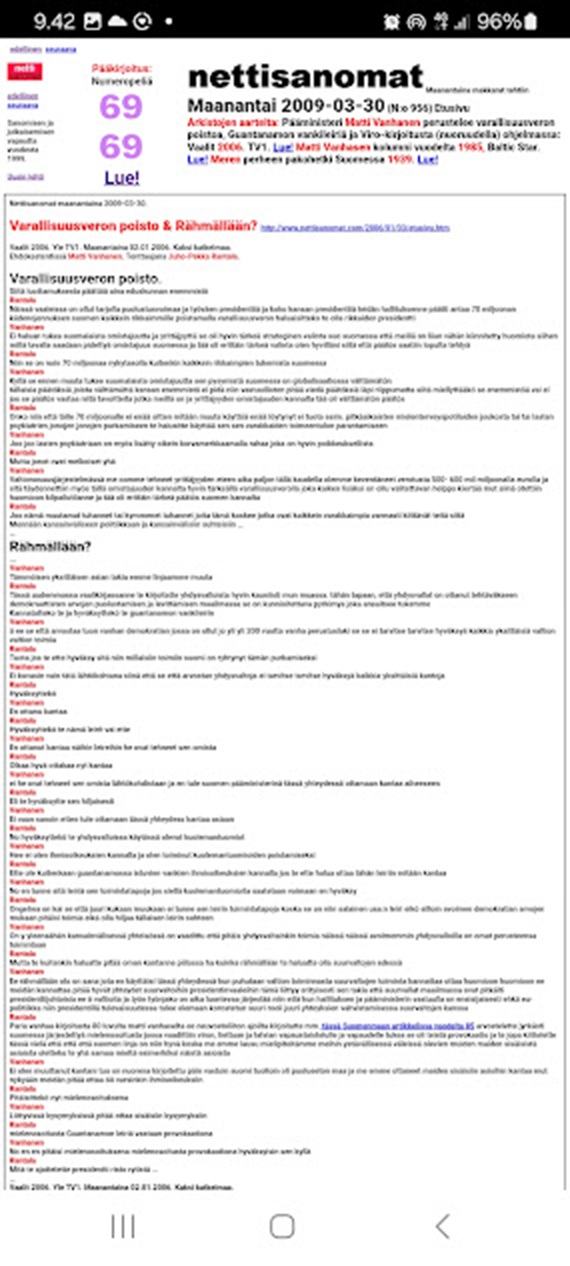 Nettisanomat 2009/956 — maanantai 30. maaliskuuta 2009INGRESSINumero 956 on jälleen Lakisanomat-nimellä ilmestyvä kooste, joka kattaa maaliskuun 2009 päivittäiset lisäykset numerosta 947 (su 8.3.) numeroon 956 (ma 30.3.). Numeron hallitsevat teemat ovat kolme: Matti Vanhasen yksityiselämä-skandaalien jatkuminen (uusi kihlaus Sirkka Mertalan kanssa, uudet seksivihjailut tuntemattomalle naiselle), Vanhasen vuoden 1985 Baltic Star -kolumni Viron vapautuliikkeestä ja suomettuminen (Sofi Oksanen nostaa esille, Mauno Koivisto ei kadu) sekä Vanhasen eläkeiän nostoehdotus ja Lex Nokia (sähköpostien tarkkailulaki). Lehti on suoraan päivittäinen – nettisanomat julkaisee sisältöä lähes joka päivä. Maaliskuun 2009 arkistokooste sisältää myös kansainväliset teemat (Gazan fosforipommit, AIG-bonusskandaali, Venäjän varustautuminen, Ranskan yleislakot) Guardianin kautta välitettyinä. PÄÄKIRJOITUKSET1. "Numeropeliä. 69 on 3:lla jaollinen." (lauantai 28.3.2009) Pääkirjoitus 956. Manninen kirjoittaa kuvitteellisen virkapuhelun Vanhasen ja tulevan morsiamen välillä: "Hei täällä sulhanen, olen kuullut, että 7 päivää julkaisee jollekin tuntemattomalle naiselle lähettämäni asento-tekstiviestit seuraavassa numerossaan. Jotta minä välttyisin suuremmalta numerolta, olen ajatellut, että julkaisen kihlauksemme 69 tunnin päästä." Pääministerin morsian Sirkka (ei siis Sinikka): "Kyllä se minulle sopii, 69 on jaollinen 3:lla, ja olenkin jo odottanut tätä kolmatta." Numero 69 on numeropeli: lehden numero, asentoon viittaava ja kolmella jaollinen (Vanhanen kolmas kerta). 2. "Turhan tylyä." (torstai 26.3.2009) Pääkirjoitus Koiviston Viron-linjauksista: Presidentti Mauno Koivisto oli liian tyly virolaisille. Olisihan hän voinut hiukan ymmärtäväisemmin suhtautua virolaisten pyrkimyksille menettämättä siinä mitään, eikä olla Mihail Gorbatšovin sätkynukke. Manninen kirjoittaa omakohtaisesti: kävi Tallinnassa 1965 Helsingin yliopiston vesipallojoukkueessa, nautti Neuvostoliiton valtion ruplia, joi samppanjaa virolaisille junariin saakka. Koivisto nyt selittelee ettei virolaisilla ollut mitään osuutta Neuvostoliiton luhistumiseen — Manninen on eri mieltä: kaikki asiat olivat kietoutuneet yhteen. 3. "Ojasta allikkoon." (torstai 19.3.2009) Iltalehti lähetti pääministeri Vanhaselle meilin ihan aiheesta. Masentavaa meilissä on kuitenkin se, että Vanhasella olisi mieluummin pitänyt vaieta. Historia löytää varsinaisen pääkonnan — presidentti Mauno Koiviston. Matti Vanhasen suoranainen valehtelu on Ikea-luokkaa kun hän väittää ettei muista kyseistä kirjoitusta: nettisanomat julkaisi sen jo joulukuussa 2005 ja siitä kysyttiin televisiotentissä. Tässä numerossa julkaistaan Baltic Star uudelleen. 4. "Matti Vanhanen, agentti." (tiistai 3.3.2009) Pääministeri Matti Vanhanen kertoi vanhuusekäkkeen eläkeiän nostopäätöksen syntyneen hänen päässään hiihdellessä Rukan laduilla, esitettyään sen Jyrki Kataiselle. Manninen: uskokoon ken tahtoo. Oikeasti esitys on päätetty sylttytehtaalla ja Vanhanen on alistunut juoksupojaksi. Hyötyjät on se sylttytehdas. Tavalliset palkansaajat, jotka jaksavat sinnitellä viimeisillä voimillaan ja jäävät eläkkeelle keskimäärin 59-vuotiaina. Huipentuma: "Matti Vanhanen on alentunut agentiksi luottaen siihen, että kansalaiset eivät tätä huomaa. Seuraavaksi vuorossa on Nato, uskokaa tai älkää!" ALAKIRJOITUKSET1. Vanhanen & Sirkka Mertala — uusi kihlaus 7 päivää torstaina 26.3. ja perjantaina 27.3.2009: "Matti Vanhanen lähetti yh-äidille seksivihjailuja." Vanhanen piti poikkeuksellisen tiedotustilaisuuden seiskan kansijutun takia. PR-konsultti Wille Wilenius: "Onpa laskelmoitua, Matti!" — "Yllättävä riskinotto Matti Vanhaselta." Kihlaus Sirkka Mertalan kanssa ilmoitettiin 69 tunnin huomautusajan sisällä. 2. Baltic Star — Vanhasen kolumni 1985 Matti Vanhanen kirjoitti Suomenmaassa 30.7.1985 kolumnin, jossa leimasi Baltic Star -laivan tuomat Viron vapausliikkeen kannattajat "provokatoorisiksi" ja "marginaali-ilmiöksi". Hän piti mielenosoitusta Neuvostoliiton lähetystön vieressä laittomana ja kutsui järjestäjiä yhdeksi viittein. Kolumni on julkaistu nettisanomissa ensi kerran jo 14.12.2005 kavkaz.fi-sivustolta löydettynä. Nyt kolumni julkaistaan kokonaisuudessaan jälleen. Sofi Oksanen ihmettelee MTV3:n kymmenen uutisissa tiistaina 17.3.2009: "Palkitun Puhdistus-kirjan tekijä Sofi Oksanen ihmettelee suomalaispoliitikkojen karua suhtautumista Viron vapautusliikkeeseen 80-luvun loppupuolella. Hän vaatii avointa keskustelua suomettumisen ajasta." Iltalehden pääkirjoitusmeili Vanhaselle: "Voisitte pyytää anteeksi turhaa suomettumistanne." Kari Kivelä on Iltalehden vastaava päätoimittaja. 3. Mauno Koivisto ei kadu Viro-lausuntojaan MTV3 seitsemän uutiset lauantaina 21.3.2009: Koivisto ei kadu Viro-lausuntojaan. Kolme teksti-tv-otsikkoa: "Koivisto ei kadu Viro-lausuntojaan — Koivisto: Suomi kumartaa länteen — Koivisto ei halua Suomea Natoon." Manninen kuvaa teksti-tv:stä — kuvan tärähdys johtuu kissan hypättyä kuvaajan käsivarsille. 4. Meren perheen pakohetki 1939 Eesti Ekspress 19.3.2009: "Perekond Meri saladuslik paohetk Soomes." Tarmo Vahter teki arkistolöydön: Lennart Meren isä Georg yritti lähettää lapsensa ulkomaille pelastaakseen heidät tulevasta kyydittämisestä vuonna 1939. Manninen osti lehden R-kioskista Jyväskylän matkakeskuksessa — 2 euroa — ja luki minkä ymmärsi. Kuvat otettu Jyväskylän rautatieaseman Hesburgerissa. Manninen yhdistää tämän Lennart Meren muistojuttuun vuodelta 2006. 5. "MIG koululaisen kuvittelemin värein" Kuva 18.3.2009 Jyväskylän Aren aukiolta: museoon siirretty MIG-hävittäjä koululaisten maalaamin värein esillä torilla. Otsikko: "Miekat sirpeiksi." Yhteys Viro-teemaan ja rauhanteemaan on selvä. 6. Vanhasen eläkeiän nosto ja sylttytehdas Vanhuusekäkkeen eläkeiän nosto: Va