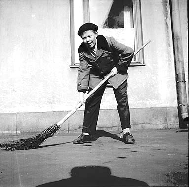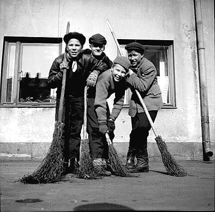 Talkkarin iloiset apulaiset luutineen pihaa lakaisemassa. Ikkunasta heijastuu