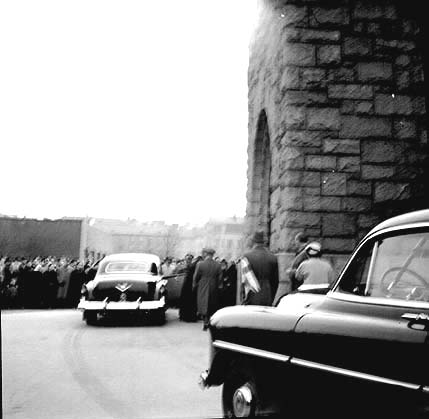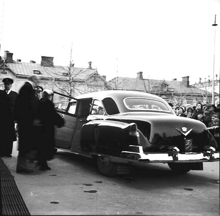 Ensimmäinen uutiskuva: Vastavalittu presidentti Urho Kekkonen ja rouva Sylvi Kekkonen astuvat suoraan autosta Kallion kirkon uudelleenvihkimis- jumalan-palvelukseen sankan katselijajoukon seuratessa tapahtumaa. |