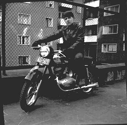 Pihan ensimmäinen moottoripyörä! Leon isoveli istuu ylväänä tsekkiläisen Jawan satulassa, verkkoaidan vierellä, asfalttiin piirrettyjen parpiruutujen valtiaana. |