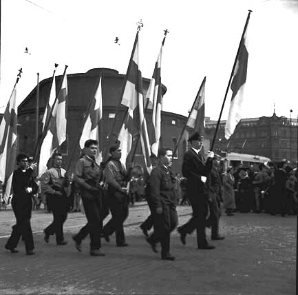 29.4.1956. Partiolaisten Yrjönpäivän-paraatin lippuryhmä Ruotsalaisen teatterin edessä Mannerheimin-tiellä. |