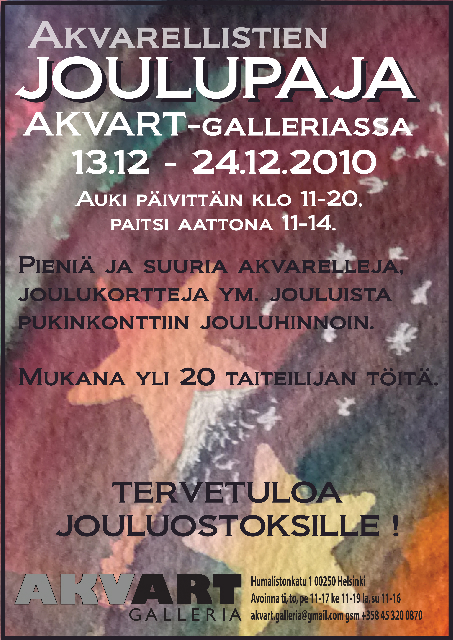 asti. Galleria on joululomalla 25.12 - 2.1.2011 ja avaa ovensa taas 3.1 Liisa Pankolan avajaisilla. Akvart galleria toivottaa kaikille ystävilleen RAUHALLISTA JOULUA! Monday, December 13, 2010 |