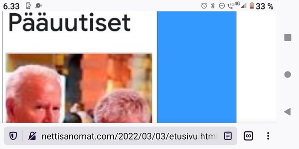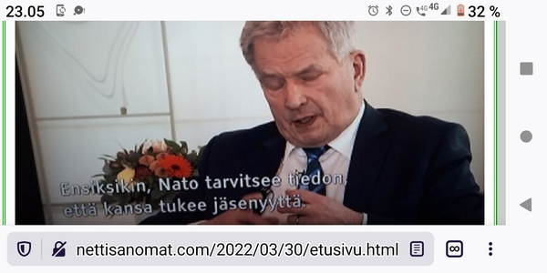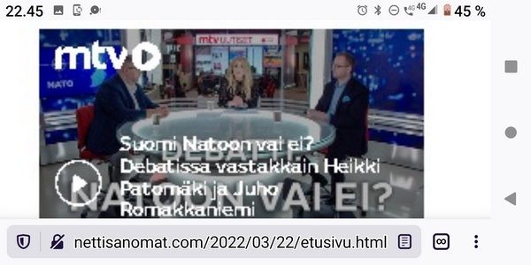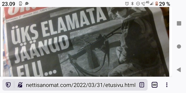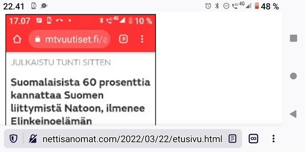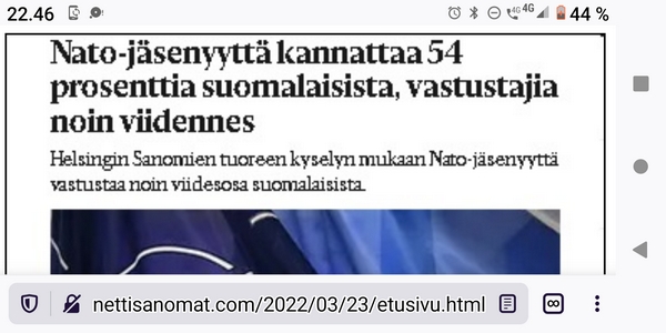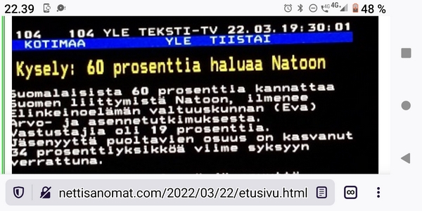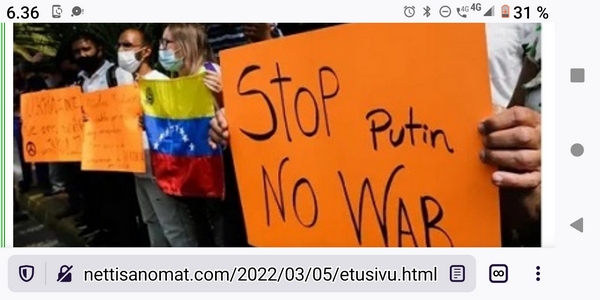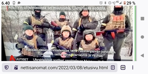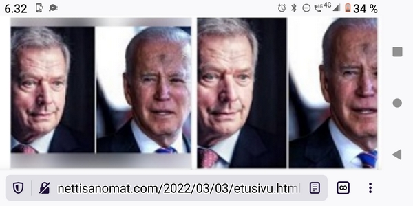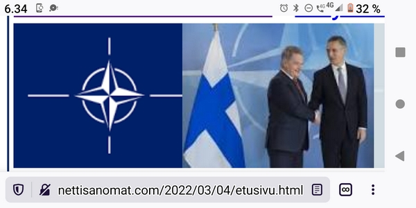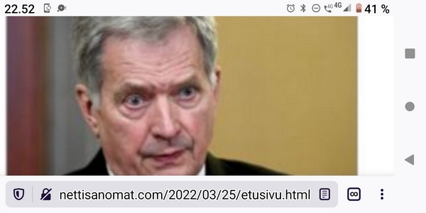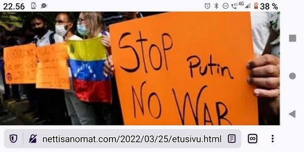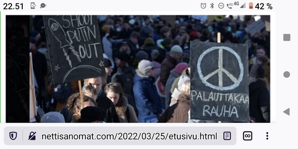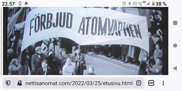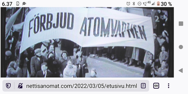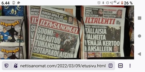 Kuvat 2022.03 Maaliskuu 2022/03/02 N:o 2469 - Tarja Salmi-Jacobson. Mitä kirjastoni on merkinnyt minulle. Kallion kirjasto. Helsinki. 2022/03/03 N:o 2470 - Pääuutiset. Puhuvatko Niinistö ja Biden myös Suomen Nato-jäsenyydestä? Niinistö ja Biden keskustelevat ainakin Natosta. 2022/03/04 N:o 2471 - Ympyrä sulkeutuu. 2006. Keskustelua turvallisuudesta. - 2012. Presidentti Niinistö vakuuttaa Nato-linjan pysyvyyttä. - 2016. . Pääkirjoitus. Niinistö, Nato ja Trump. Suomen presidentin väärinkäsitys USA:n presidentin vallasta. - Iltalehti 10.11.2016 Päivän meili. Tasavallan presidentti Sauli Niinistö. - 2018 ja 2020. Presidentti Niinistö eduskunnalta pimitetystä NATO-järjestelystä. - 2022. Pääkirjoitus. Suomi lähettää tykkejä sotaan. - 2022. Presidentti Niinistö Washingtonissa: Turvallisuus- ja puolustusyhteistyötä Yhdysvaltojen kanssa tiivistetään. - Pääuutiset. Puhuvatko Niinistö ja Biden myös Suomen Nato-jäsenyydestä? Niinistö ja Biden keskustelevat ainakin Natosta. 2022/03/05 N:o 2472 - Året var 1957. Dokumentär SVT2. "Förbjud atomvapnen". - (9.1.2007). Arkistokuva 2003 tammikuu. NO WAR AGAINST IRAQ! (23.1.2003). Lee Celanon kuvan banderollit. Kuvat tiistaina 8.3.2022. Kansainvälinen naistenpäivä. 2022/03/08 N:o 2475 - Tiistai 8. maaliskuuta. Kansainvälinen naistenpäivä. AlfaTV. Ukrainassa sotatila. Auutiset. Ukrainalaiset sotilaat onnittelevat Naistenpäivän johdosta. 2022/03/09 N:o 2474 - Piilotettu sota vs. Näkyvä sota. Iltapäivälehdet marketeissa LIDL ja City Market. Suomi varautuu tuhansiin sotapakolaisiin. Sota-asiantuntija: Tällaisia valheita Venäjä kertoo kansalleen. Kuvat perjantaina 19.3.2022. Minna Canthin päivä. Tasa-arvon päivä. 2022/03/19 N:o 2475 - Minna Canthin päivä. Tasa-arvon päivä. "Minna Canth muistettuna". 2022/03/20 N:o 2476 - Pääkirjoitus. HS-gallupin omaksuman tutkimustavan mukaan 71 posenttia kansanedustajista kannattaa Natoon liittymistä! 2022/03/20 N:o 2476 - Arkistokuva. Lauantaina 25.09.2004. " Helsingin Sanomat pönöttää uljaasti Postitalon ja Eduskuntatalon edessä. Kuuliaiset puoluejohtajat pitävät normaalisti majaansa oikealla olevassa sivurakennuksessa." (25.9.2004). 2022/03/22 N:o 2477 - Salaliitto väärentää Nato-galluppeja? Evan väärennetty Nato-gallup 22.3.2022. Kuvat keskiviikkona 23.3.2022. 2022/03/23 N:o 2478 - Salaliitto väärentää Nato-galluppeja? - HS:n uusi väärennös tänään 23.3.2022. 2022/03/24 N:o 2479 - Yle Radio1 aamulla klo 5:59 ja 6:00 puheentunnistuksella. 2022/03/25 N:o 2480 -