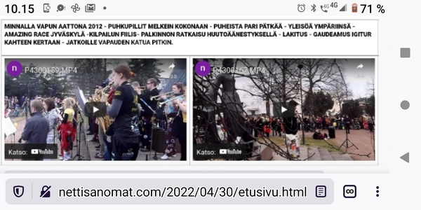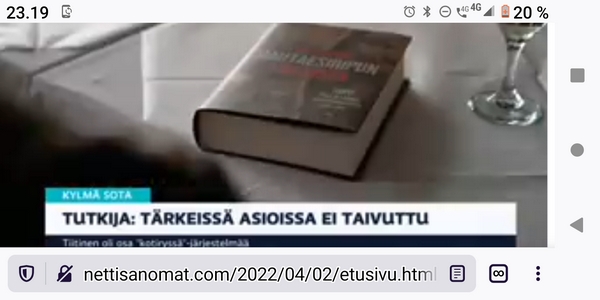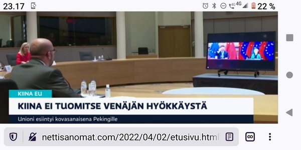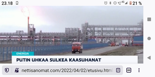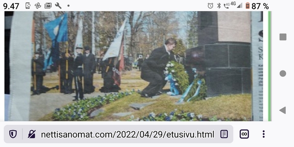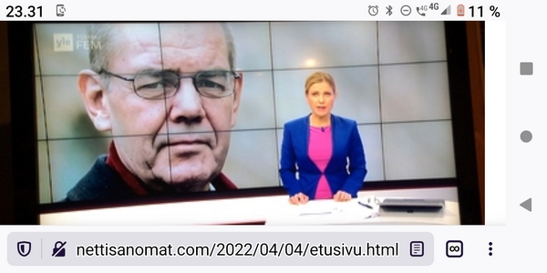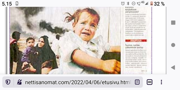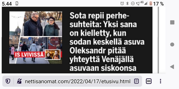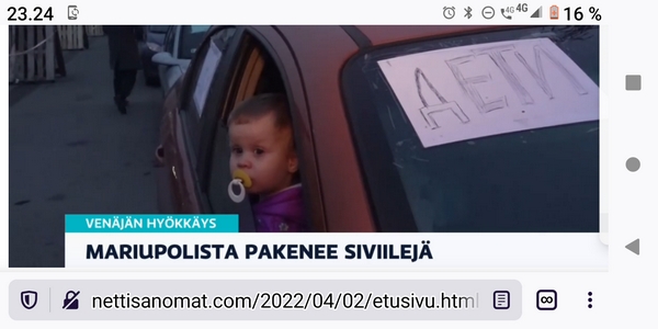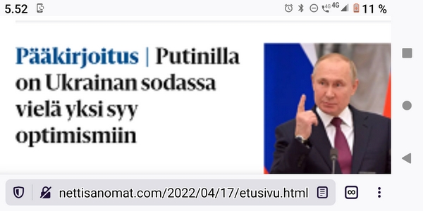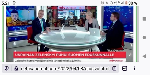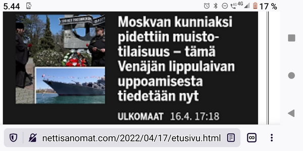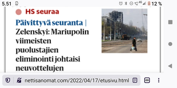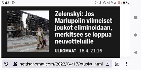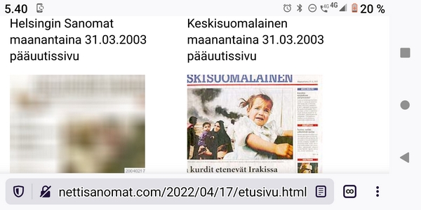 eduskunnan käytävällä. - MTV UUTISET "Näin Marin kommentoi Zelenskyin puhetta." Kuvasarja. 2022/04/08 N:o 2491 - "The hypocrisies of the war supporters are only possible if we forget the context and history of modern wars. Ukraine did not come out of a clear blue sky." 2022/04/08 N:o 2491 - 22 vuotta ja 5 kuukautta sitten 28.10.1999. Tsetsenia: Äidit hakevat varusmiespoikiaan pois sodasta. 2022/04/08 N:o 2491 - Pääkirjoitus. Suomi lähettää tykkejä sotaan. Hallitus, presidentti, pääministeri Sanna Marin, tasavallan presidentti Sauli Niinistö, Yle. (27.2.2022). 2022/04/12 N:o 2492 - Året var 1957. Dokumentär SVT2. "Förbjud atomvapnen". - (9.1.2007). Kuvat torstaina 16.4.2022. Kiirastorstai. 2022/04/14 N:o 2493 - Året var 1957. Dokumentär SVT2. "Förbjud atomvapnen". - (9.1.2007). Kuvat perjantaina 15.4.2022. Pitkäperjantai. Kuvat lauantaina 16.4.2022. Lankalauantai. 2022/04/16 N:o 2495 - Naakat. Uusimaa. Kirkkonummi. Kärrytie torstaina 7.4.2022 15:51. Kuvat sunnuntaina 17.4.2022. Pääsiäispäivä. P 2022/04/17 N:o 2496 - Pääsiäinen. Arkisto 2003. Irak. Sodan kaksi näkökulmaa: Suorittajat ja siviilit. Molemmat uhreja? - Uutinen HS:stä ja Keskisuomalaisesta. 2022/04/17 N:o 2496 - USA:n rakasta kalustoa saapunut. Mariupolin puolustajien tuho. Seitsemän median otsikot. Kuvat perjantaina 22.4.2022. 2022/04/22 N:o 2497 -