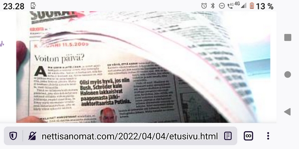 Iltalehti Keskiviikkona 11.05.2005. Kopio. "Olisi myös hyvä, jos niin Bush, Schröder kuin Halonen lakkaisivat paapomasta jälkiauktoritaarista Putinia." 2022/04/04 N:o 2488 - Supernova. Kuvitelma mahtipontisesta sotilasparaatista. (10.5.2005). Voitonpäivä: "Maailman johtajat juhlivat sodan loppua Moskovassa.. Presidentti Vladimir Putin: "Sota tuli jokaiseen kotiin. - Meidän on puolustettava nykyistä maailmanjärjestystä, joka perustuu turvallisuuteen ja oikeudenmukaisuuteen, uuteen keskinäisten suhteiden kulttuuriin, joka ei salli kylmien sotien eikä todellisten sotien toistuvan." 2022/04/04 N:o 2488 - "The hypocrisies of the war supporters are only possible if we forget the context and history of modern wars. Ukraine did not come out of a clear blue sky." 2022/04/06 N:o 2489 - 21. vuosisadan 22 ensimmäisen vuoden huhtikuun ensimmäisen viikon valittu aihe, kuva ja linkki sivulle. Kuvasarja. "Sodan kaksi näkökulmaa: Suorittajat ja siviilit. Molemmat uhreja? Helsingin Sanomat: USA:n maavoimien huolto vaikeuksissa. Keskisuomalainen: Vain kurdit etenevät Irakissa." (3.4.2003). 2022/04/07 N:o 2490 - Nato 1 ja Nato 2. - hs24.fi - SIVUT VUODELTA 2009