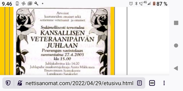 veteraanipäivä. Arkistokutsu vuodelta 2003. 2022/04/30 N:o 2499 - Paths of Glory. 2022/04/30 N:o 2499 - Kymmenen vuotta on kulunut. Kymmenen kuvaa huhtikuun 1:stä 30:een vuonna 2012. 2022/04/30 N:o 2499 - Kymmenen vuotta on kulunut. Kymmenen kuvaa huhtikuun 1:stä 30:een vuonna 2012. 2022/04/30 N:o 2499 - 1.4. Sisäilmaongelmat. 5.4. Suudelma huhtikuussa. 6.4. Tuulta päin. 8.4. "Memphis." 15.4. Valokuvaaja Caj Bremerin näyttelyssä. 18.4. "Ei tule enää täti sinulle juttelemaan ikkunasta ..." 21.4. "Buffetin pitäjät odottavat asiakkaita pelien välissä!" 22.4. "Kuvaus: Vaasan Vasamattaret". 28.4. "Koiran kiinnostus." 29.4. "Harry's" 30.4. MINNALLA VAPUN AATTONA 2012 - PUHKUPILLIT - PUHEISTA - YLEISÖÄ - AMAZING RACE - LAKITUS - GAUDEAMUS IGITUR - JATKOILLE. Toukokuun 2022 kuvat täällä! |