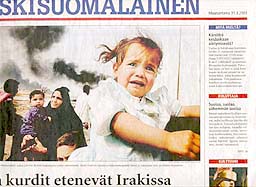 kurdit etenevät Irakissa. Jorma Tuomi-Nikula. Liittoutuman hyökkäys Irakiin on menettämässä voimaansa. Ainoat joukot, jotka sunnuntaina pystyivät etenemään, olivat kurdien peshmerga-taistelijat, jotka lähestyvät kurdien pääkaupunkinaan pitämää Kirkukia. Bagdadiin pyrkivät amerikkalaiset näyttävät ryhmittyvän jopa viikkoja kestävään puolustukseen. Basraa piirittävät britit sanovat ottaneensa 30 vankia ja tappaneensa saman verran Irakin sotilaita. Basran sanotaan silti yhä olevan irakilaisjoukkojen hallussa. Basran miljoonakaupungin asukkaat kärsivät jo vakavasta vesi- ja elintarvikepulasta. Tuhannet pakenevat taisteluja maalle. Luvatut elintarvikelähetykset ovat olleet vähäisiä ja suurin osa on avustusjärjestöjen mukaan joutunut vääriin käsiin. Bagdadin puolustajat ovat saamassa avukseen itsemurhatehtäviin sitoutuneita arabeja. Irakin armeijan mukaan noin 4 000 taistelijaa on jo saapunut Jordaniasta Bagdadiin. Eräs heidän ykköstehtävistään on liittouman huoltokuljetusten häirintä. Sodan vuoksi eronnut Britannian ex-ulkoministeri Robin Cook hyökkäsi sunnuntaina voimakkaasti pääministeri Tony Blairin ja presidentti George W, Bushin sotapolitiikkaa vastaan. Hänen mielestään brittijoukot olisi heti kutsuttava kotiin. Ulkomaat 12-13. Keskisuomalainen maanantaina 31.03.2003. |